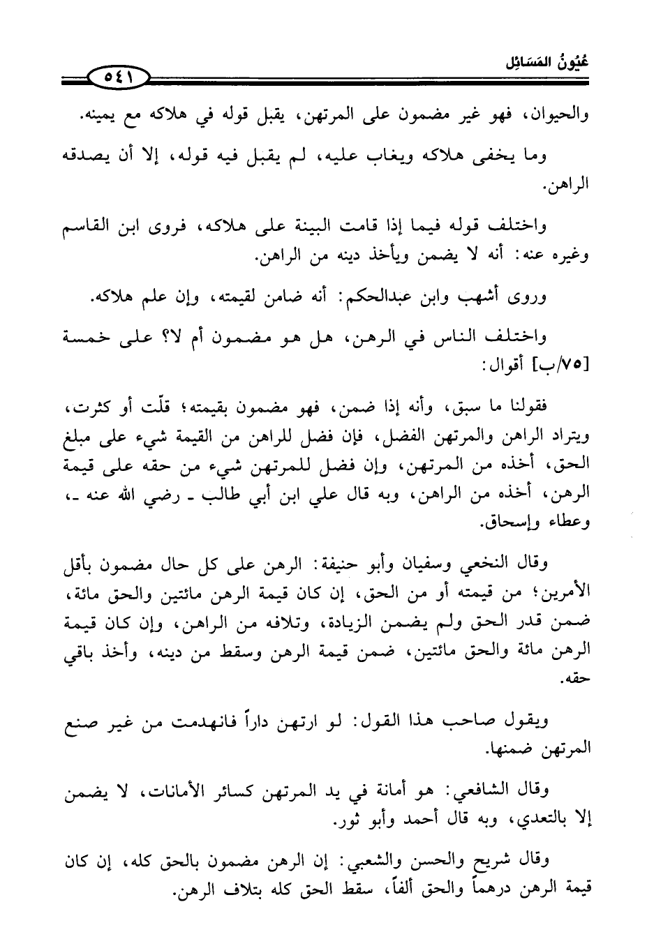 واختلف النَّاس في الرَّهْن، هل هو مضمون أم لا؟ على خمسة [75/ب] أقوال: