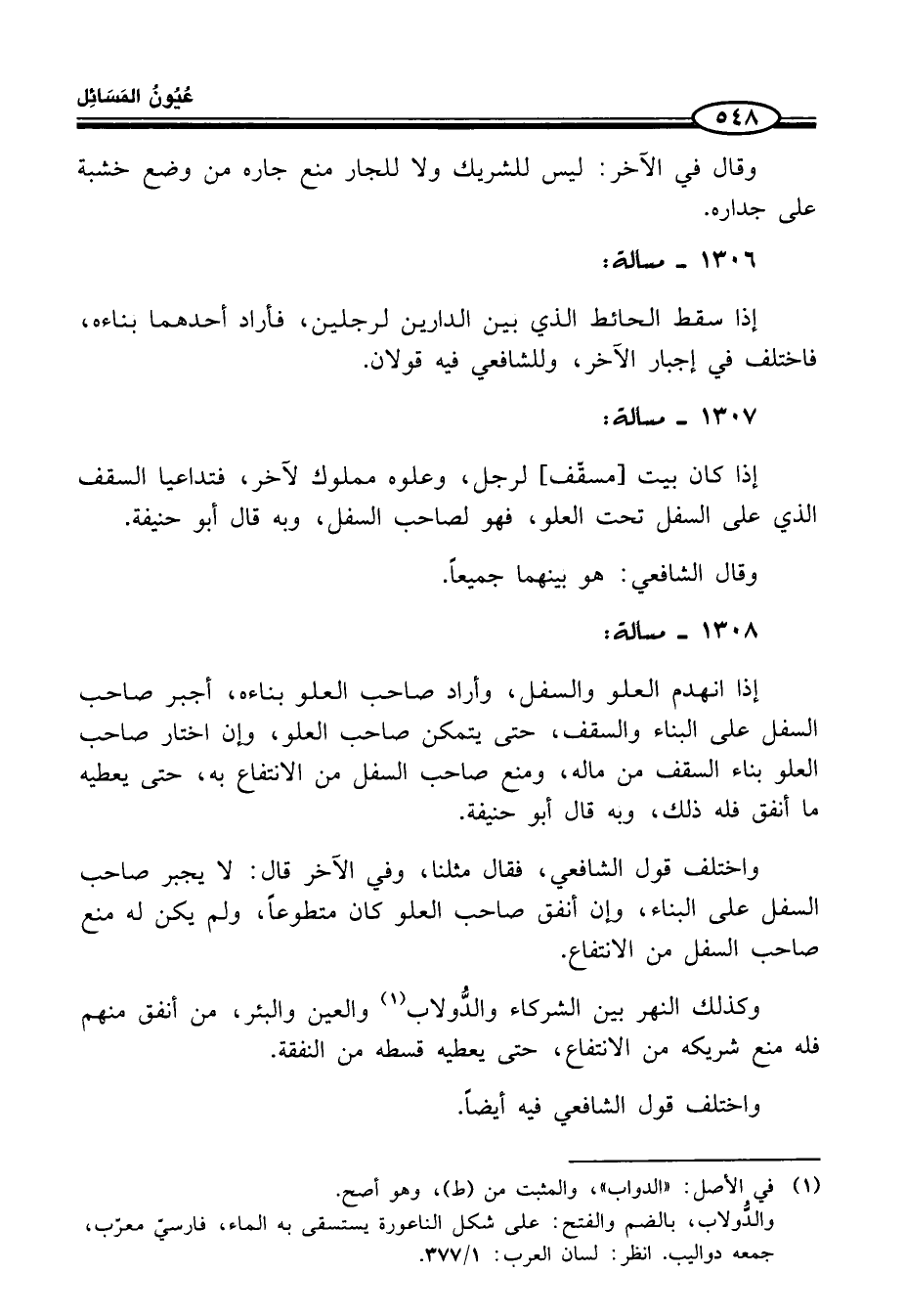وقال فى الآخر: ليس للشريك ولا للجار منع جاره من وضع خشبة على جداره.