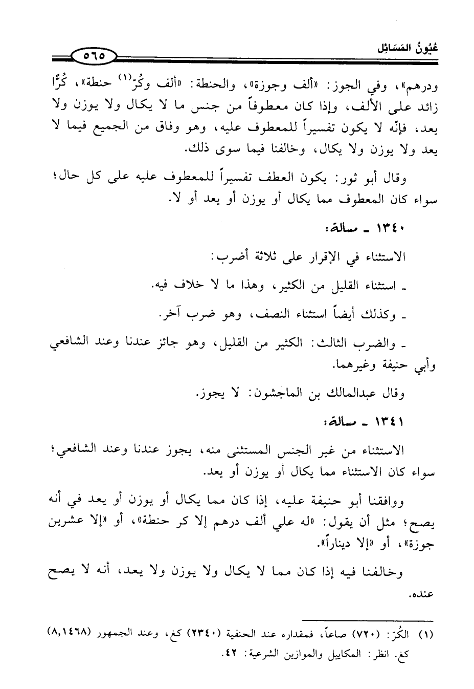 (¬1) الكُرّ: (720) صاعًا، فمقداره عند الحنفية (2340) كغ، وعند الجمهور (8.1468) كغ. انظر: المكاييل والموازين الشرعية: 42.