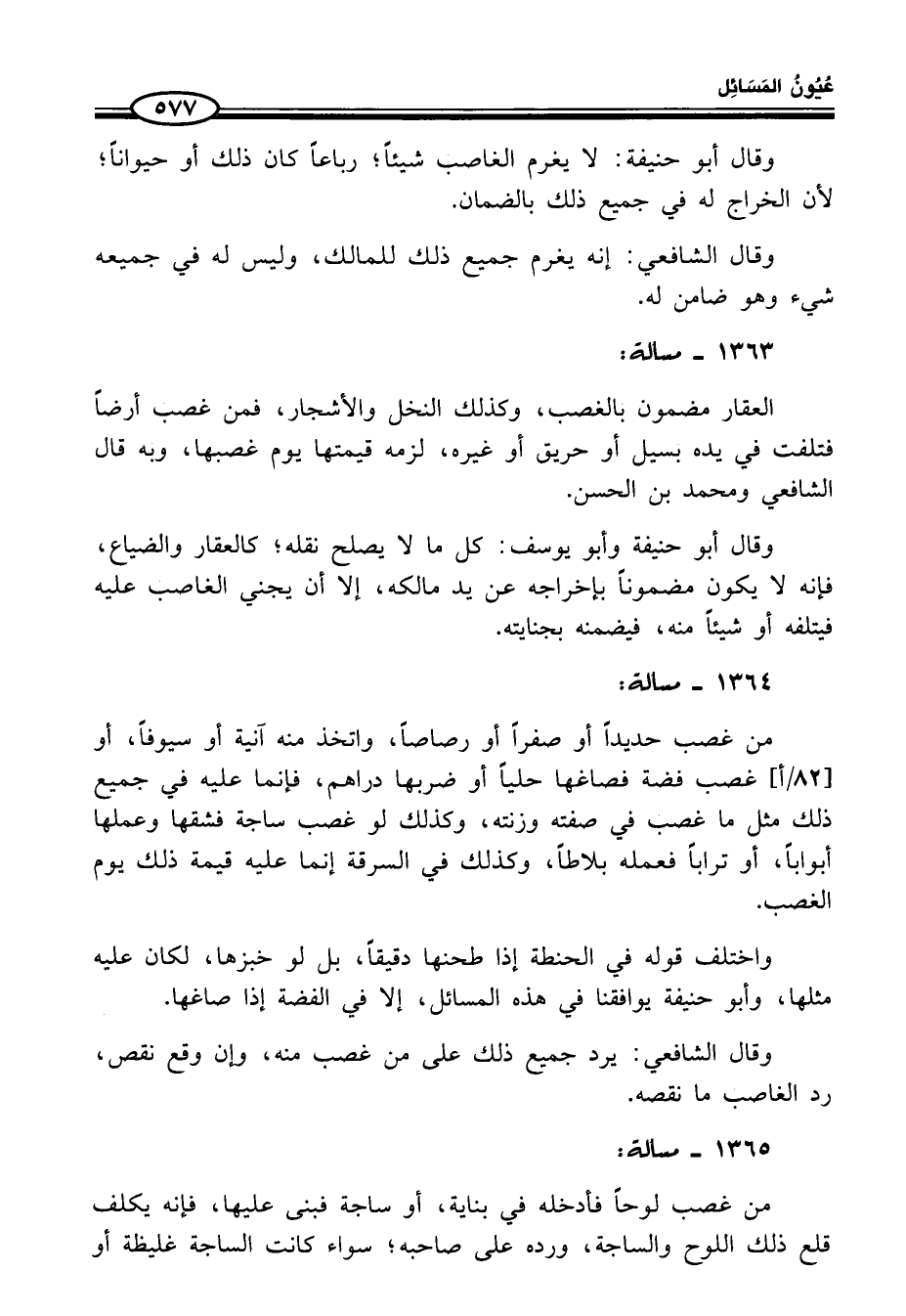 من غصب حديدًا أو صفرًا أو رصاصًا، واتخذ منه آنية أو سيوفًا، أو [82/أ] غصب فضة فصاغها حليًا أو ضربها دراهم، فإنّما عليه في جميع ذلك مثل ما غصب في صفته وزنته، وكذلك لو غصب ساجة فشقها وعملها أبوابًا، أو ترابًا فعمله بلاطًا، وكذلك في السّرقة إنّما عليه قيمة ذلك يوم الغصب.
