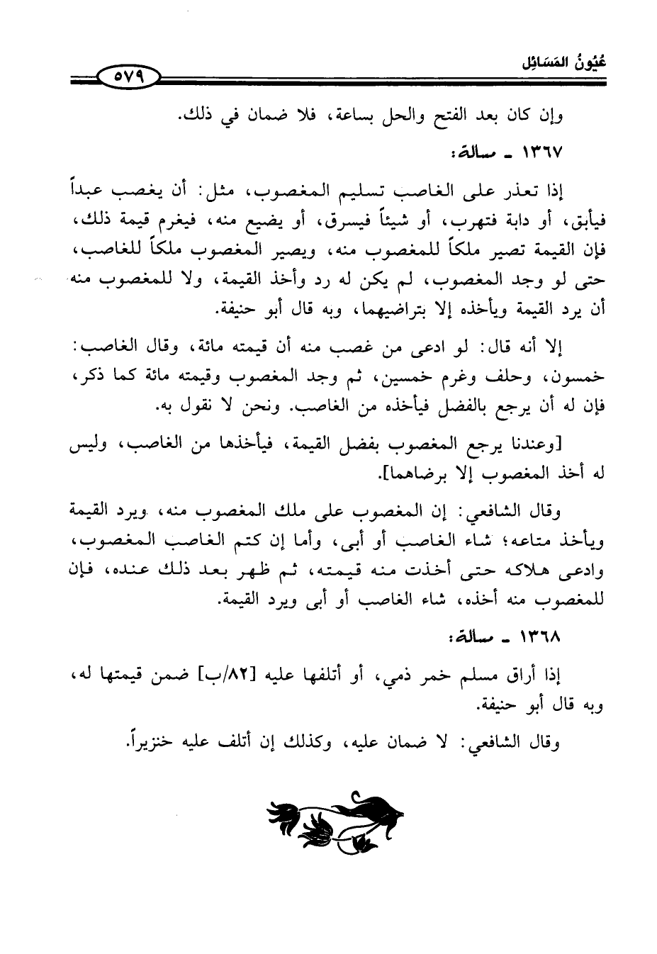 إذا تعذر على الغاصب تسليم المغصوب، مثل: أن يغصب عبدًا فيأبق، أو دابة فتهرب، أو شيئًا فيسرق، أو يضيع منه، فيغرم قيمة ذلك، فإن القيمة تفسير ملكًا للمغصوب منه، ويصير المغصوب ملكًا للغاصب، حتّى لو وجد المغصوب، لم يكن له رد وأخذ القيمة، ولا للمغصوب منه أن يردّ القيمة ويأخذه إِلَّا بتراضيهما، وبه قال أبو حنيفة.