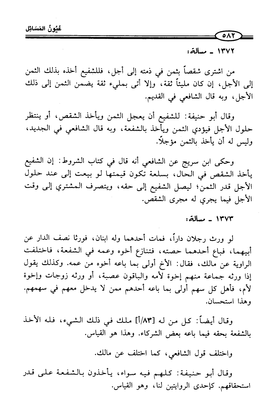 لو ورث رجلان دارًا، فمات أحدهما وله ابنان، فورثا نصف الدَّار عن أبيهما، فباع أحدهما حصته، فتنازع أخوه وعمه في الشُّفعَةِ، فاختلفت الراوية عن مالك، فقال: الأخ أولى بما باعه أخوه من عمه. وكذلك يقول إذا ورثه جماعة منهم إخوة لأمه والباقون عصبة، أو ورثه زوجات وإخوة لأم، فأهل كلّ سهم أولى بما باعه أحدهم ممّن لا يدخل معهم في سهمهم. وهذا استحسان.