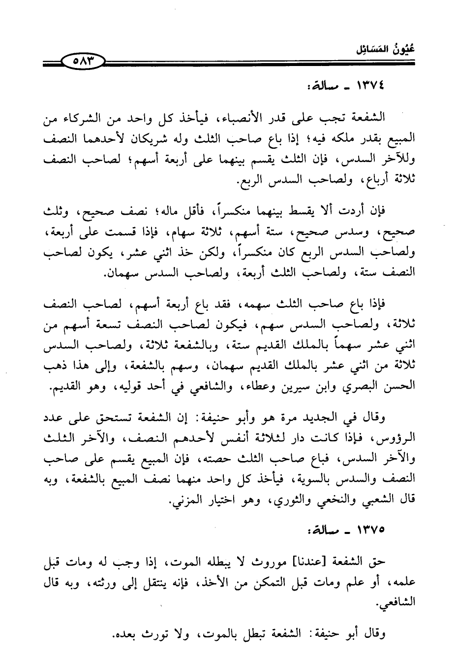 وقال في الجديد مرّة هو وأبو حنيفة: إن الشُّفعَة تستحق على عدد الرؤوس، فإذا كانت دار لثلاثة أنفس لأحدهم النّصف، والآخر الثلث والآخر السدس، فباع صاحب الثلث حصته، فإن المبيع يقسم على صاحب النّصف والسدس بالسوية، فيأخذ كلّ واحد منهما نصف المبيع بالشُّفعَةِ، وبه قال الشّعبيّ والنخعي والثوري، وهو اختيار المزني.