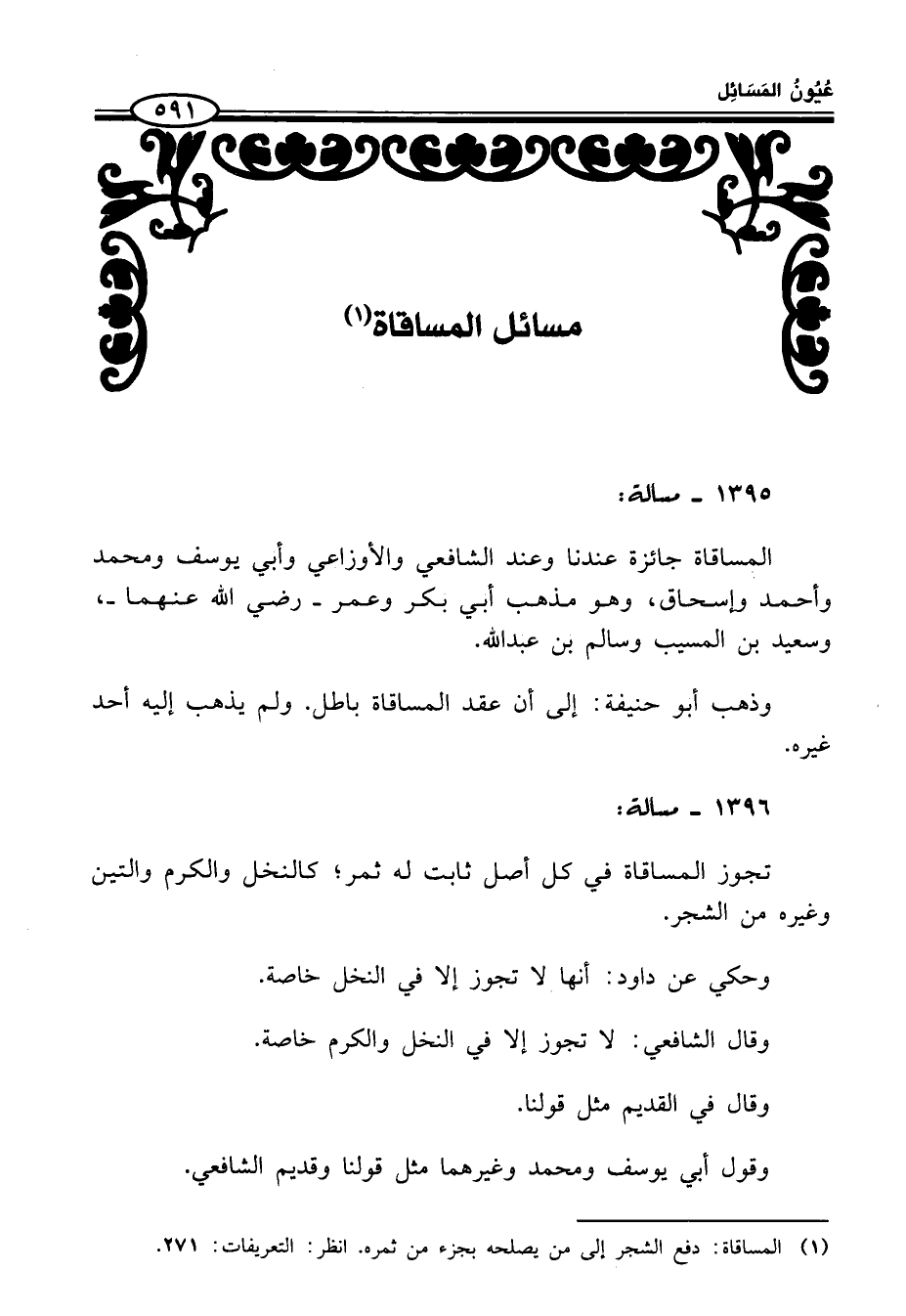 (¬1) المساقاة: دفع الشجر إلى من يصلحه بجزء من ثمره. انظر: التعريفات: 271.