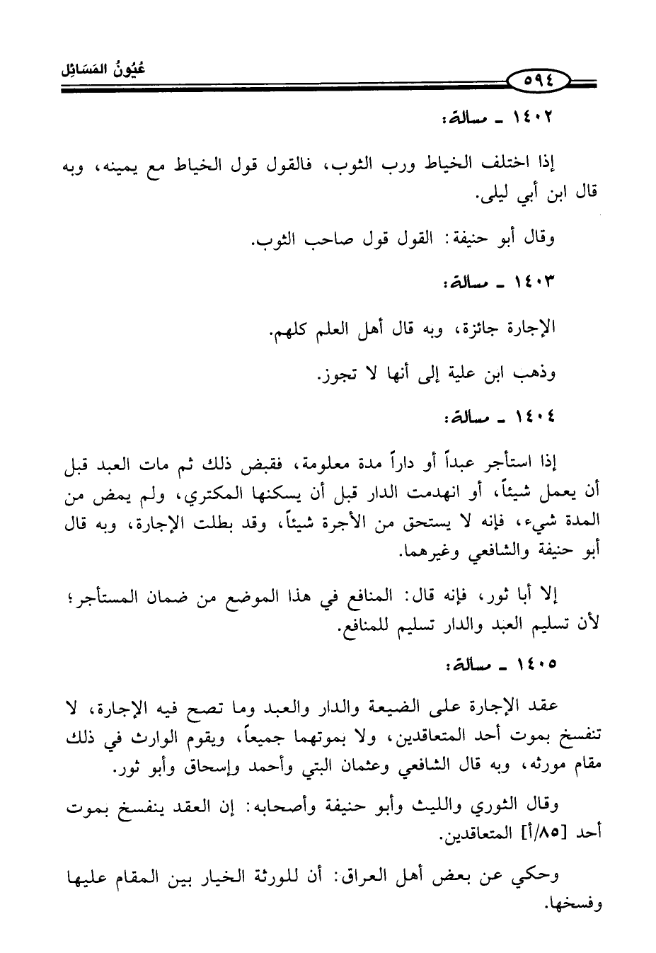 وقال الثّوريّ والليث وأبو حنيفة وأصحابه: إن العقد ينفسخ بموت أحد [85/أ] المتعاقدين.