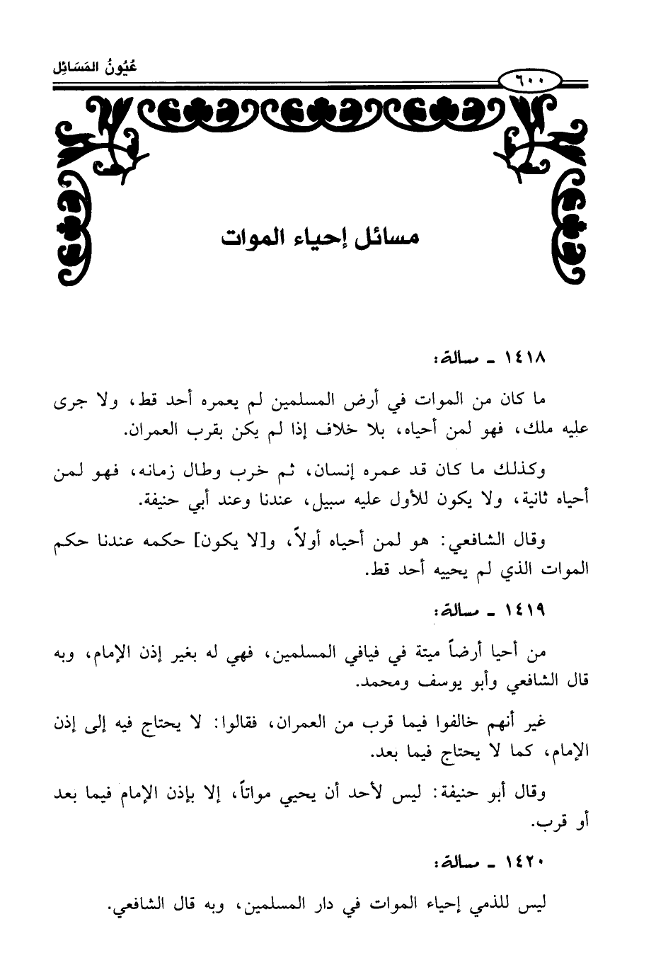 من أحيا أرضًا ميتة في فيافي المسلمين، فهي له بغير إذن الإمام، وبه قال الشّافعيّ وأبو يوسف ومحمد.