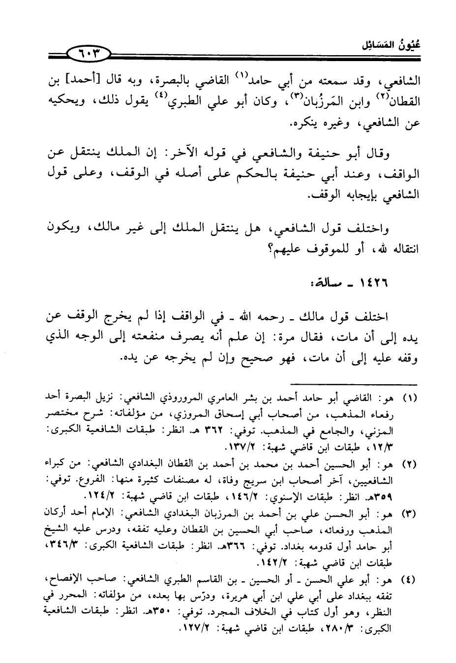 (¬3) هو: أبو الحسن علي بن أحمد بن المرزبان البغدادي الشّافعيّ: الإمام أحد أركان المذهب ورفعائه، صاحب أبي الحسين بن القطان وعليه تفقه، ودرس عليه الشّيخ أبو حامد أول قدومه بغداد. توفي: 366 هـ. انظر: طبقات الشّافعيّة الكبرى: 3/ 346، طبقات ابن قاضي شهبة: 2/ 142.