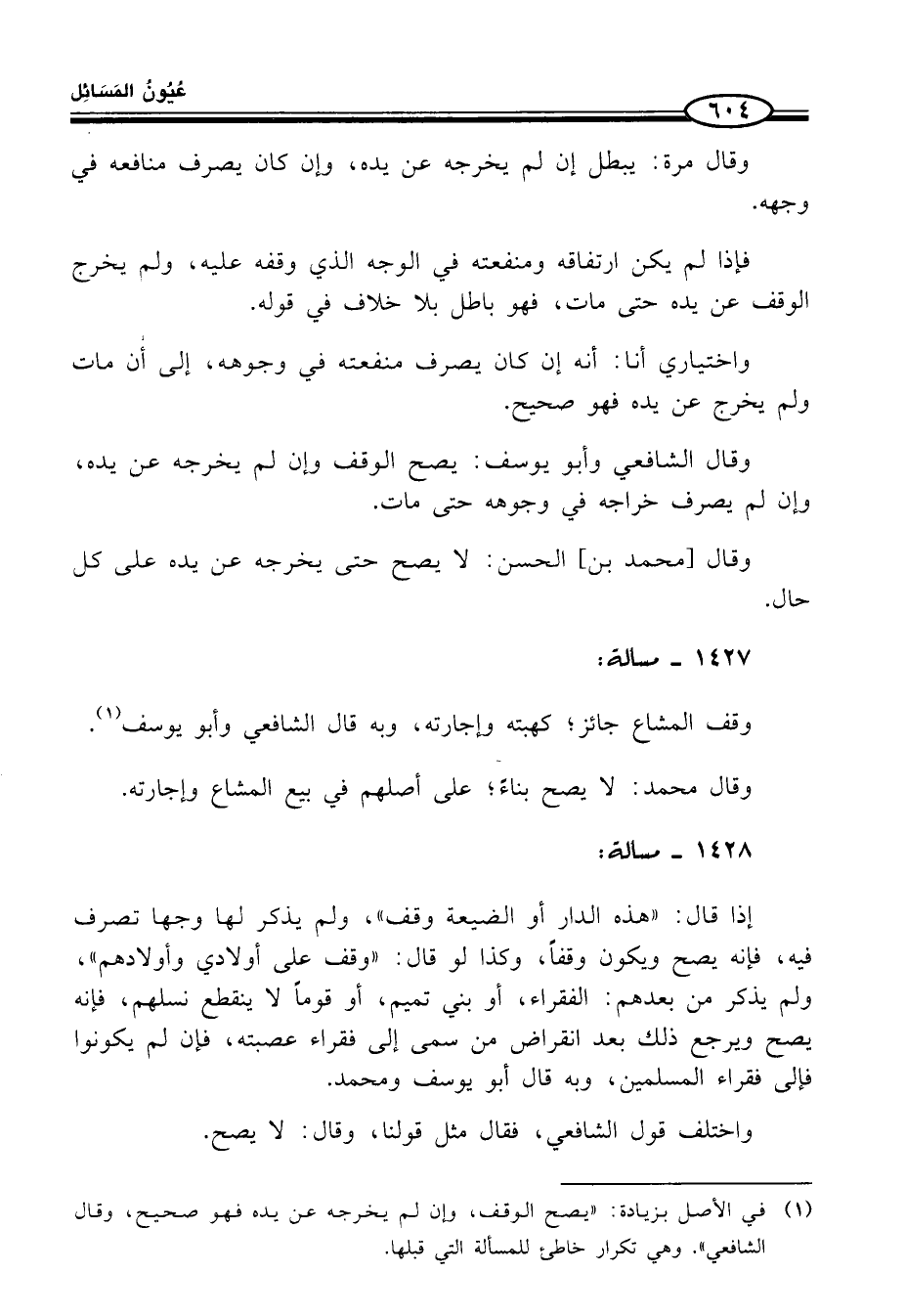 (¬1) في الأصل بزيادة: "يصح الوقف، وإن لم يخرجه عن يده فهو صحيح، وقال الشّافعيّ". وهي تكرار خاطئ للمسألة الّتي قبلها.