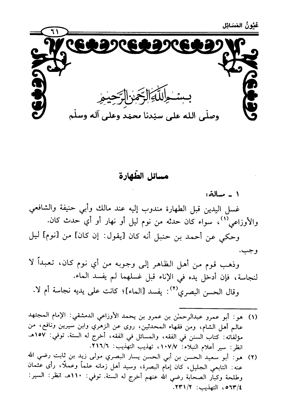 (¬1) هو: أبو عمرو عبد الرّحمن بن عمرو بن يحمد الأوزاعي الدمشقي: الإمام المجتهد عالم أهل الشّام، ومن فقهاء المحدثين، روى عن الزّهريُّ وابن سيرين ونافع، من مؤلفاته: كتاب السنن في الفقه، والمسائل في الفقه، أخرج له الستة. توفي: 157 هـ. انظر: سير أعلام النُّبَلاء: 7/ 107، تهذيب التهذيب: 6/ 216.