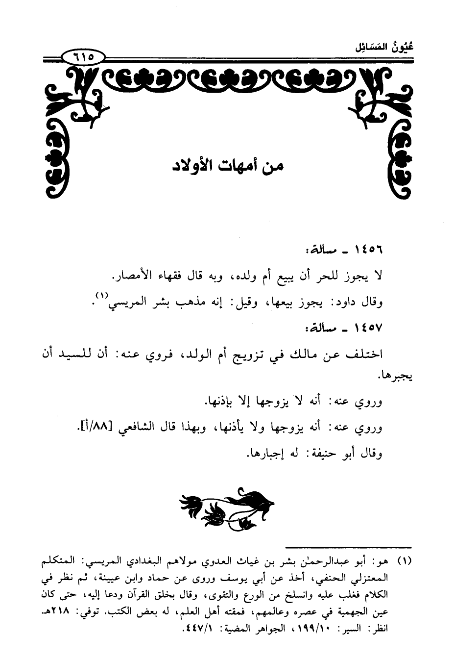 (¬1) هو: أبو عبد الرّحمن بشر بن غياث العدوي مولاهم البغدادي المريسي: المتكلم المعتزلي الحنفي، أخذ عن أبي يوسف وروى عن حماد وابن عيينة، ثمّ نظر في الكلام فغلب عليه وانسلخ من الورع والتقوى، وقال بخلق القرآن ودعا إليه، حتّى كان عين الجهمية في عصره وعالمهم، فمقته أهل العلم، له بعض الكتب. توفي: 218 هـ. انظر: السير: 10/ 199، الجواهر المضية: 1/ 447.