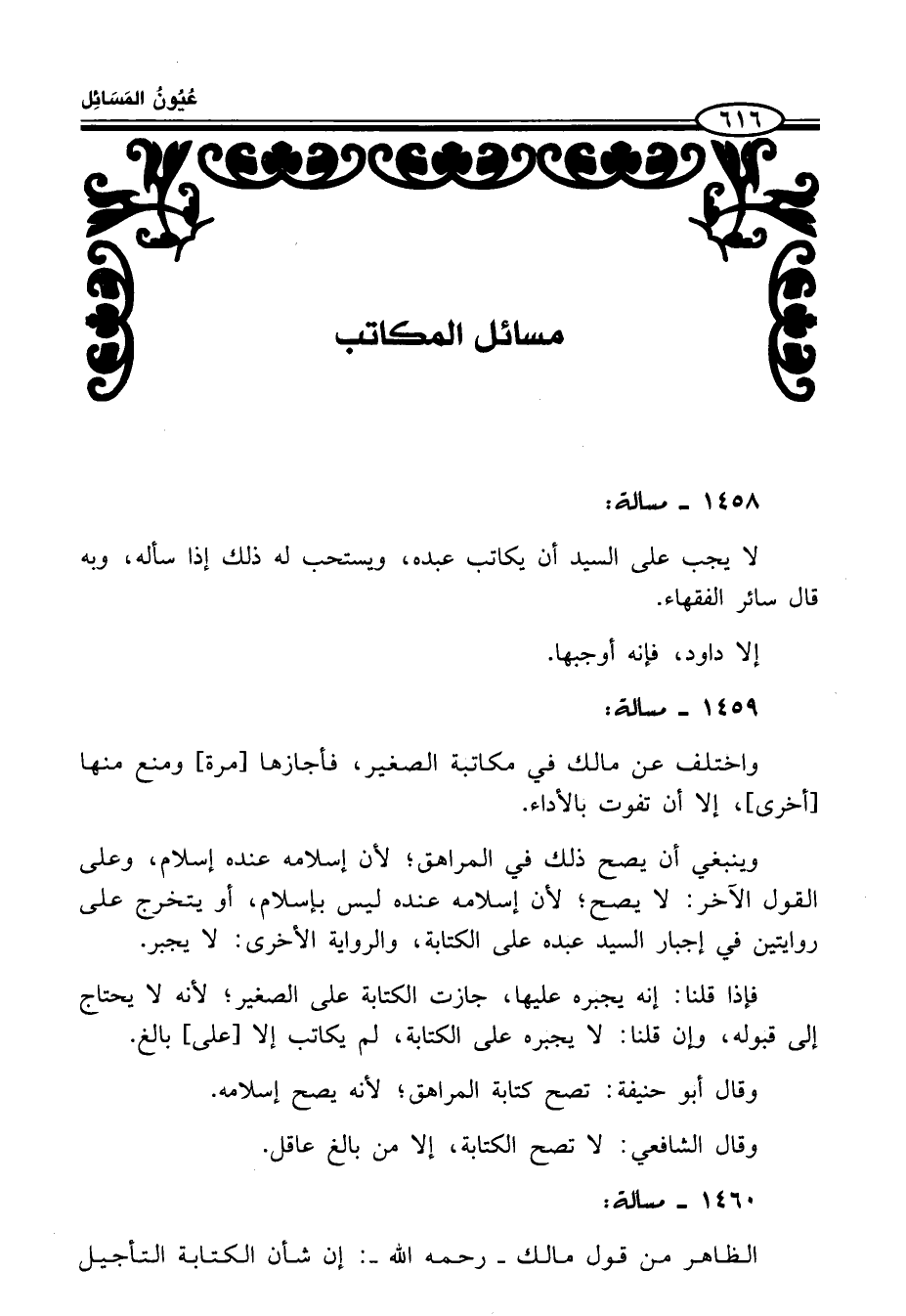 وينبغي أن يصح ذلك في المراهق؛ لأنّ إسلامه عنده إسلام، وعلى القول الآخر: لا يصح؛ لأنّ إسلامه عنده ليس بإسلام، أو يتخرج على روايتين في إجبار السَّيِّد عبده على الكتابة، والرواية الأخرى: لا يجبر.