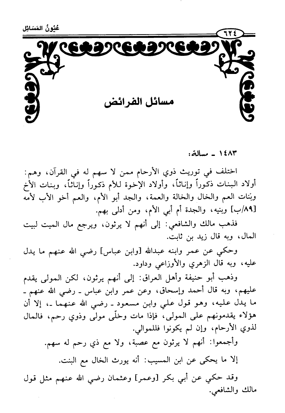 اختلف في توريث ذوي الأرحام ممّن لا سهم له في القرآن، وهم: أولاد البنات ذكورًا وإناثًا، وأولاد الإخوة للأم ذكورًا وإناثًا، وبنات الأخ وبَنات العم والخال والخالة والعمة، والجد أبو الأم، والعم أخو الأب لأمه [89/ب] وبنيه، والجدة أم أبي الأم، ومن أدلى بهم.