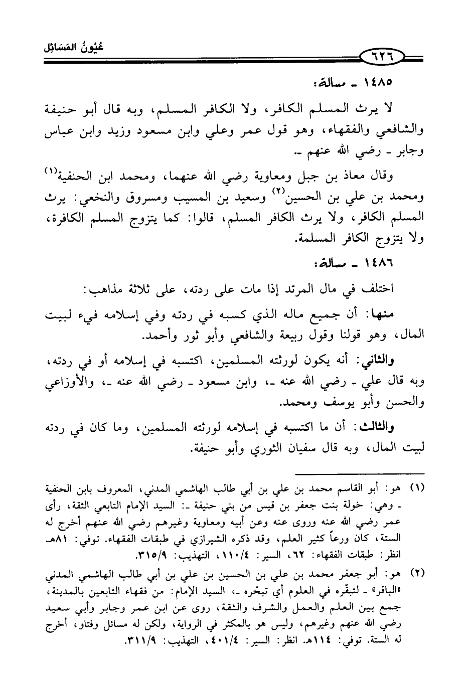 (¬2) هو: أبو جعفر محمَّد بن علي بن الحسين بن علي بن أبي طالب الهاشمي المدني "الباقر" - لتبقّره في العلوم أي تبحّره -، السَّيِّد الإمام: من فقهاء التابعين بالمدينة، جمع بين العلم والعمل والشرف والثقة، روى عن ابن عمر وجابر وأبي سعيد رضي الله عنهم وغيرهم، وليس هو بالمكثر في الرِّواية، ولكن له مسائل وفتاو، أخرج له الستة. توفي:144هـ. انظر: السير: 4/ 401، التهذيب: 9/ 311.