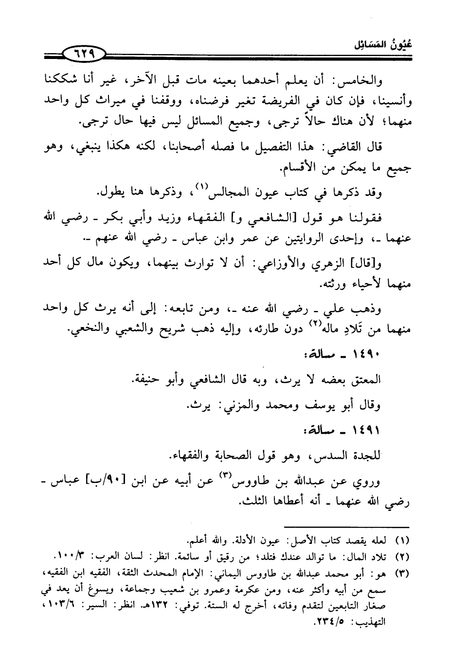 (¬3) هو: أبو محمَّد عبد الله بن طاووس اليماني: الإمام المحدث الثقة، الفقيه ابن الفقيه، سمع من أبيه وأكثر عنه، ومن عكرمة وعمرو بن شعيب وجماعة، ويسوغ أن يعد في صغار التابعين لتقدم وفاته، أخرج له الستة. توفي: 132 هـ. انظر: السير: 6/ 103، التهذيب: 5/ 234.