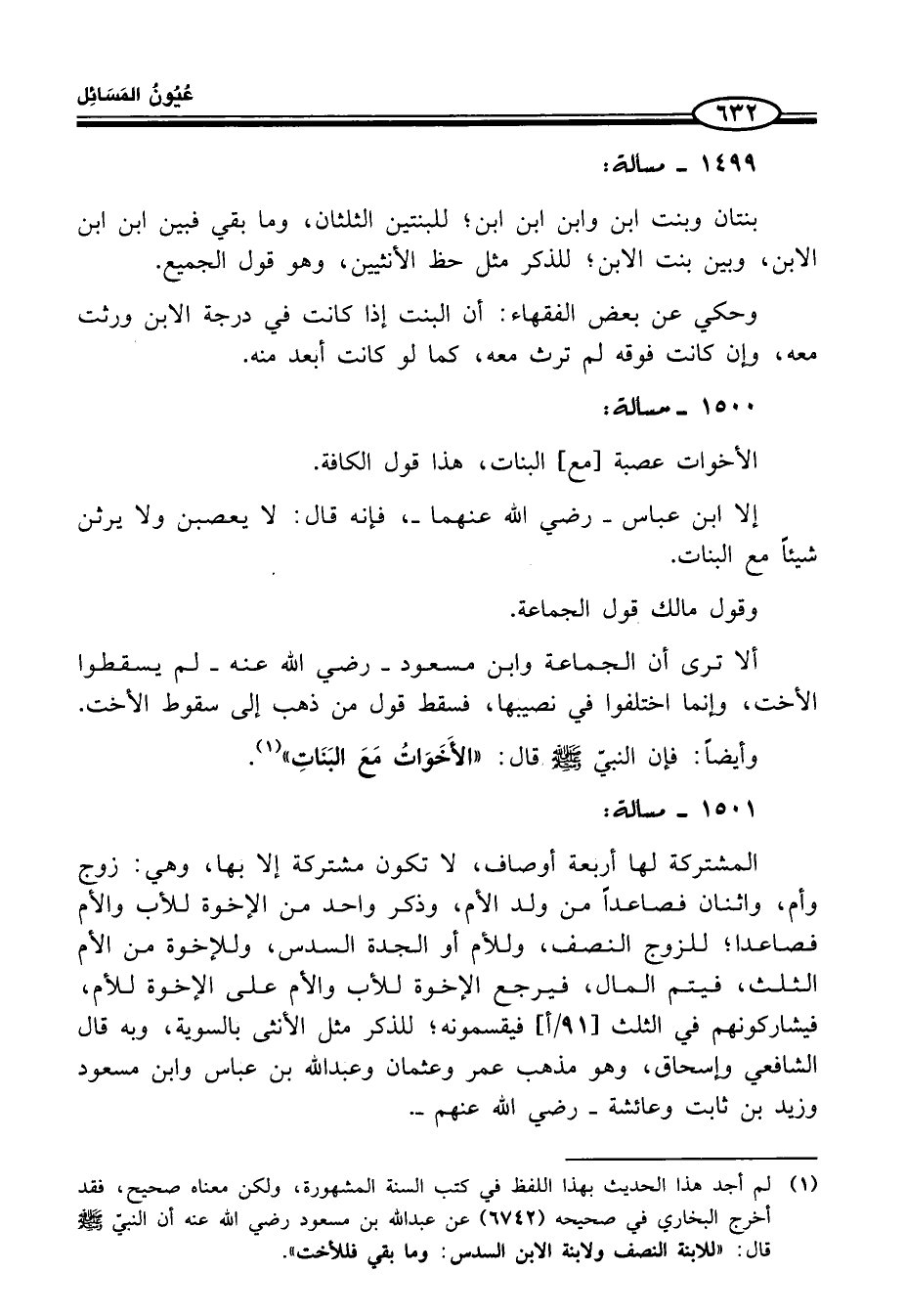 (¬1) لم أجد هذا الحديث بهذا اللّفظ في كتب السنة المشهورة، ولكن معناه صحيح، فقد أخرج البخاريّ في صحيحه (6742) عن عبد الله بن مسعود رضي الله عنه أن النّبيّ - صلّى الله عليه وسلم - قال: "للابنة النّصف ولابنة الابن السدس: وما بقى فللأخت".