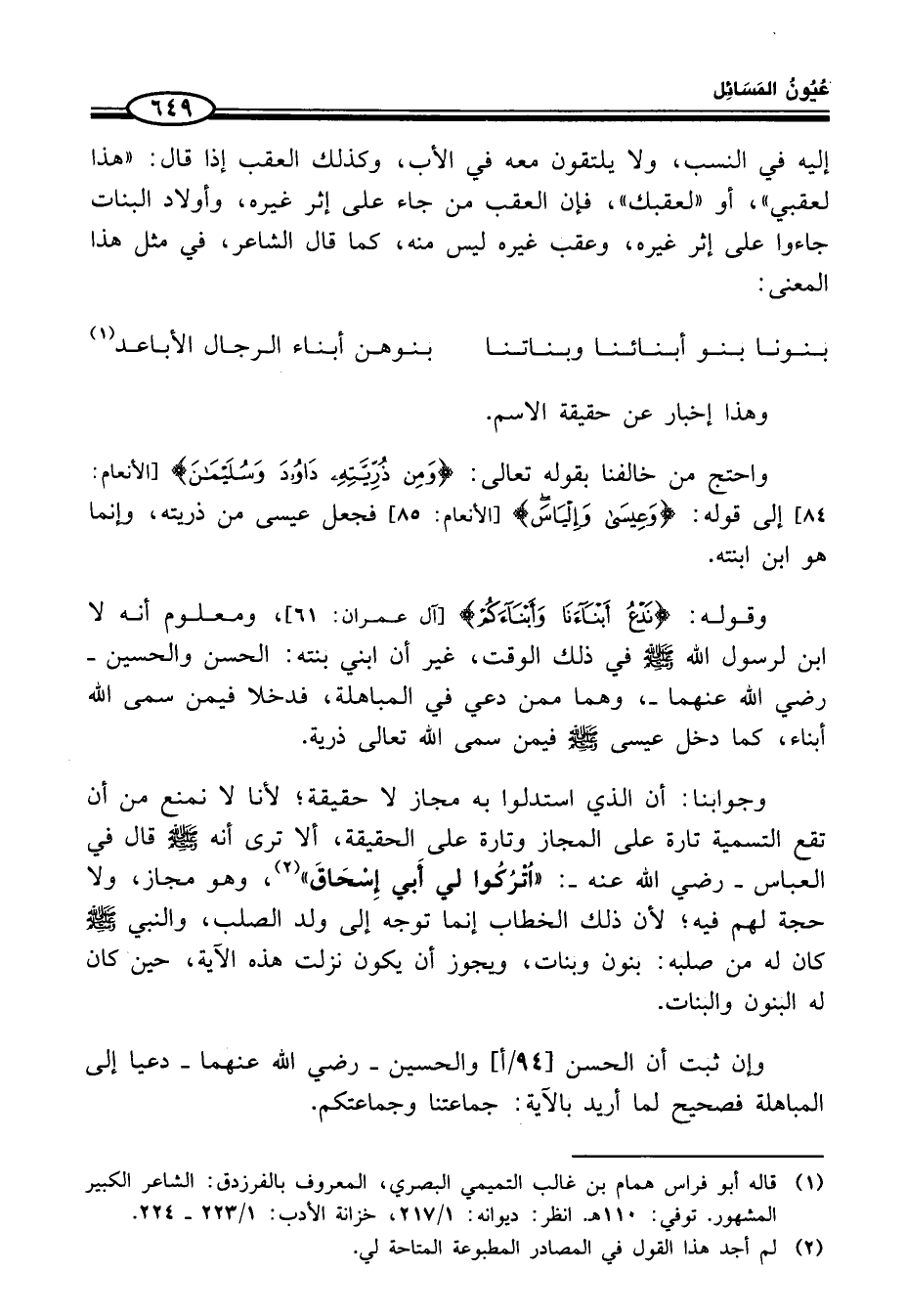 وقوله: {نَدْعُ أَبْنَاءَنَا وَأَبْنَاءَكُمْ} [آل عمران: 61]، ومعلوم أنّه لا ابن لرسول الله - صلّى الله عليه وسلم - في ذلك الوقت، غير أن ابني بنته: الحسن والحسين - رضي الله عنهما -، وهما ممّن دعي في المباهلة، فدخلا فيمن سمى الله أبناء، كما دخل عيسى - صلّى الله عليه وسلم - فيمن سمى الله تعالى ذرية.