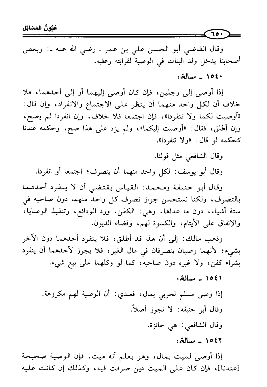 وقال القاضي أبو الحسن علي بن عمر -رضي الله عنه -: وبعض أصحابنا يدخل ولد البنات في الوصيَّة لقرابته وعقبه.