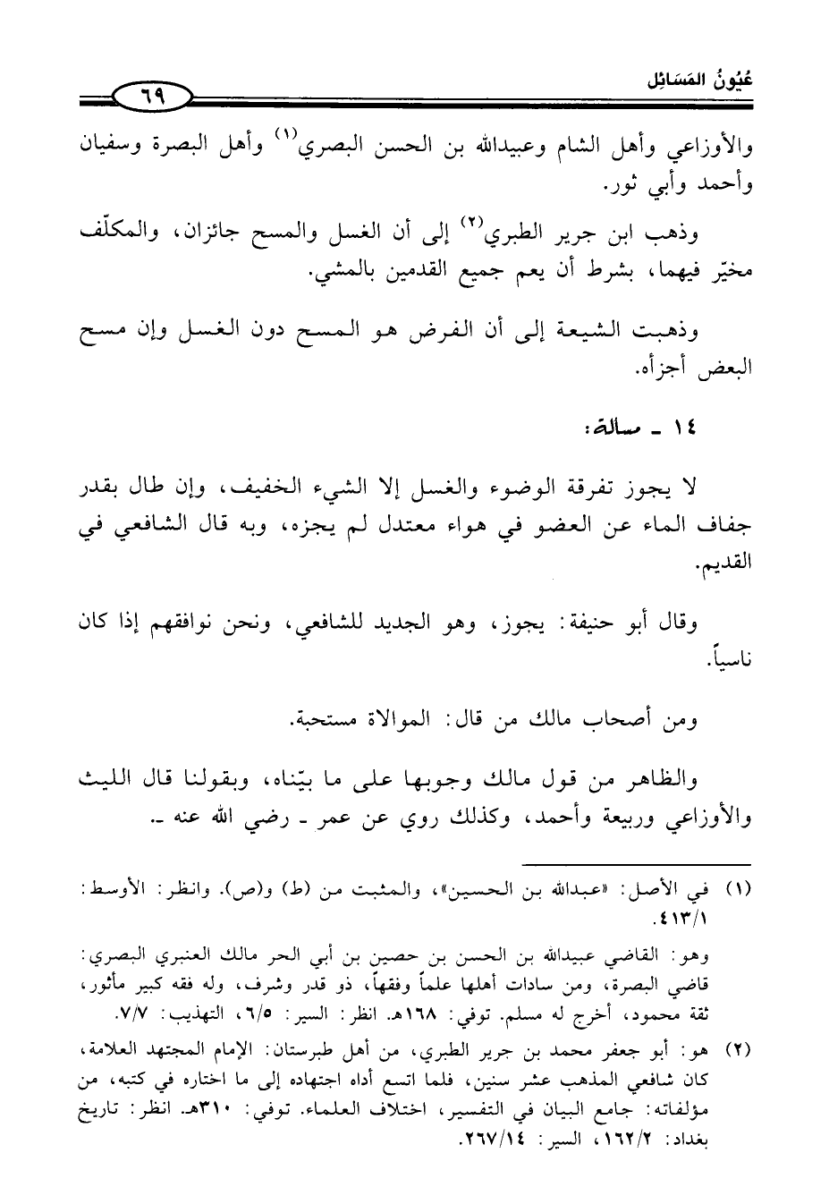 وذهب ابن جرير الطّبريّ (¬2) إلى أن الغسل والمسح جائزان، والمكلّف مخيّر فيهما، بشرط أن يعم جميع القدمين بالمشي.