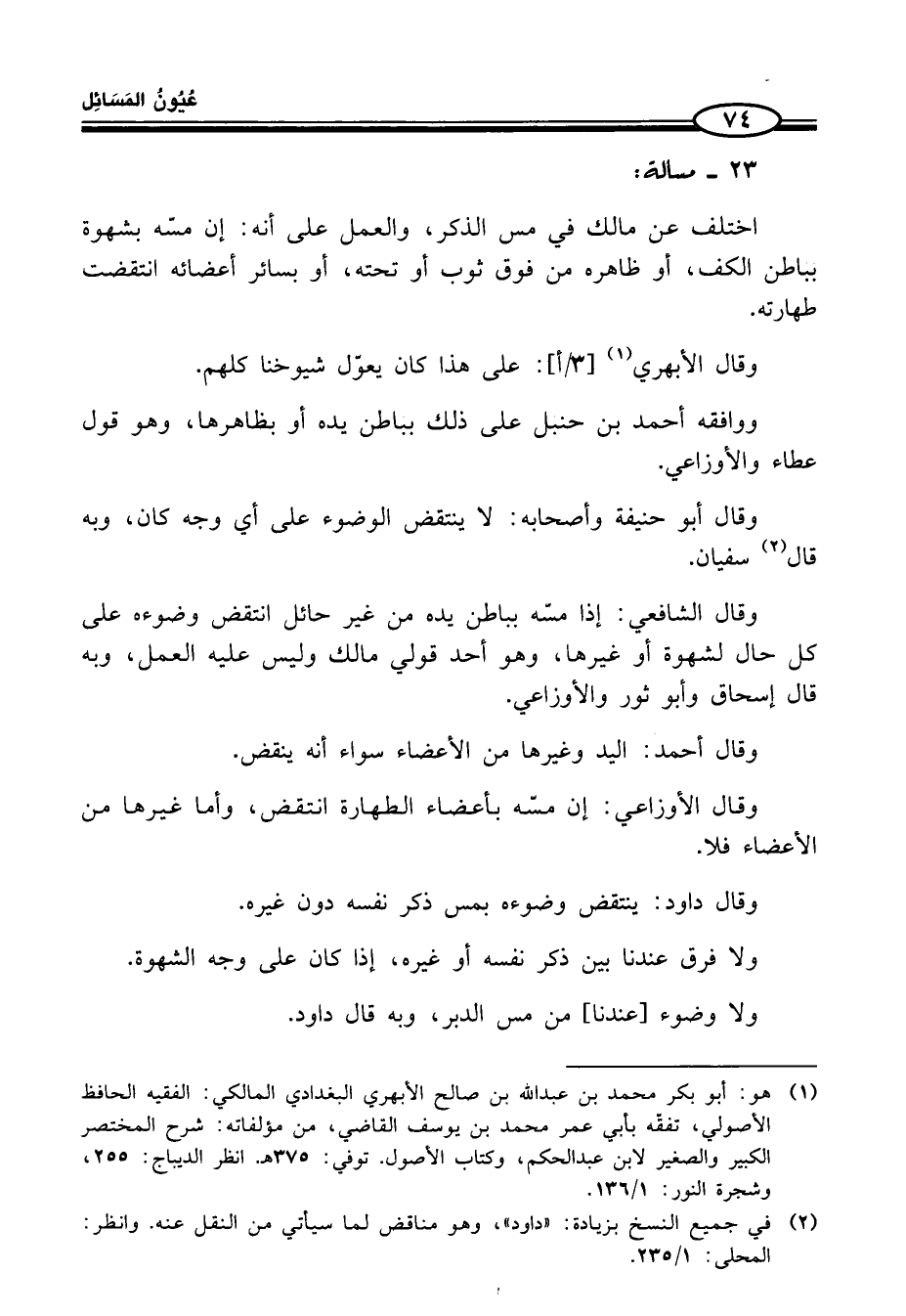 (¬1) هو: أبو بكر محمَّد بن عبد الله بن صالح الأبهري البغدادي المالكي: الفقيه الحافظ الأصولي، تفقّه بأبي عمر محمَّد بن يوسف القاضي، من مؤلفاته: شرح المختصر الكبير والصغير لابن عبد الحكم، وكتاب الأصول. توفي: 375 هـ ـ. انظر الديباج: 255، وشجرة النور: 1/ 136.