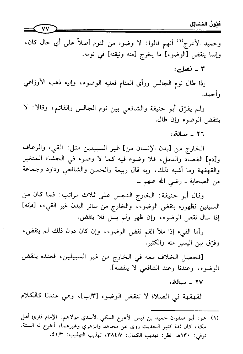 وحميد الأعرج (¬1) أنّهم قالوا: لا وضوء من النوم أصلًا على أي حال كان، وإنّما ينقض [الوضوء] ما يخرج [منه وتيقنه] في نومه.