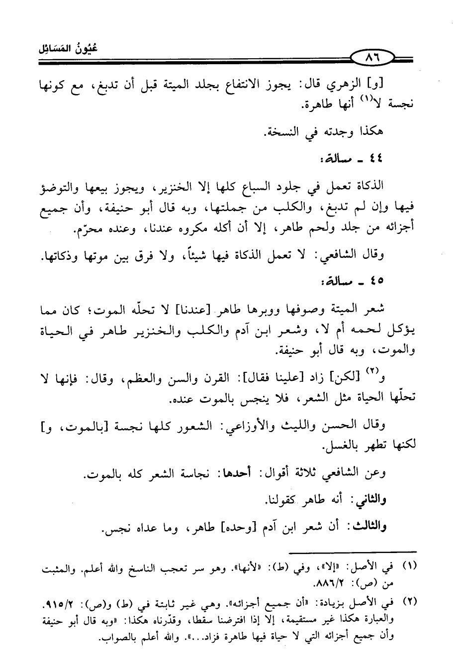 (¬2) في الأصل بزيادة: "أن جميع أجزائه". وهي غير ثابتة في (ط) و (ص): 2/ 915. والعبارة هكذا غير مستقيمة، إِلَّا إذا افترضنا سقطا، وقدّرناه هكذا: "وبه قال أبو حنيفة وأن جميع أجزائه الّتي لا حياة فيها طاهرة فزاد ... ". والله أعلم بالصواب.