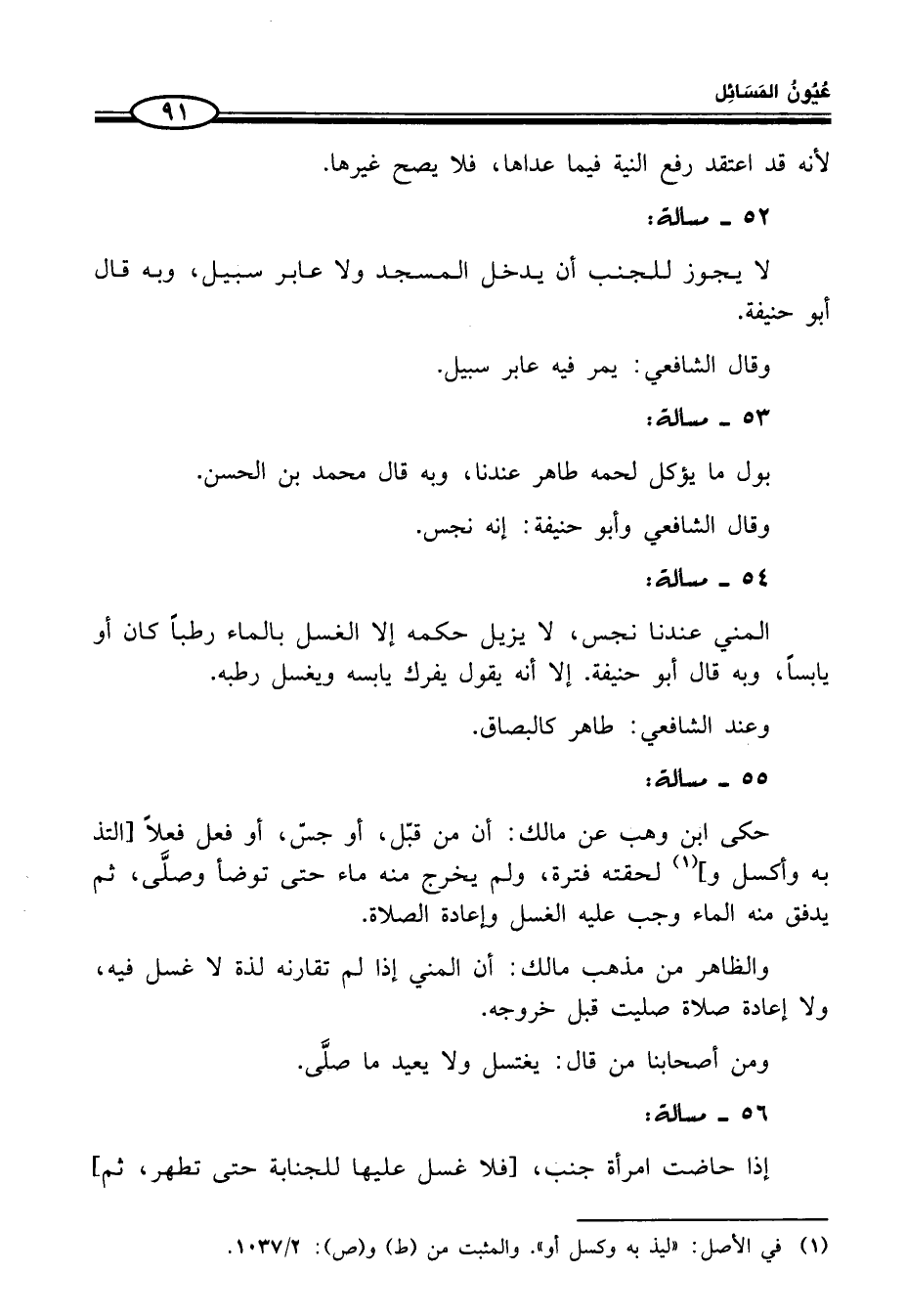 المني عندنا نجس، لا يزيل حكمه إِلَّا الغسل بالماء رطبًا كان أو يابسًا، وبه قال أبو حنيفة. إِلَّا أنّه يقول يفرك يابسه ويغسل رطبه.