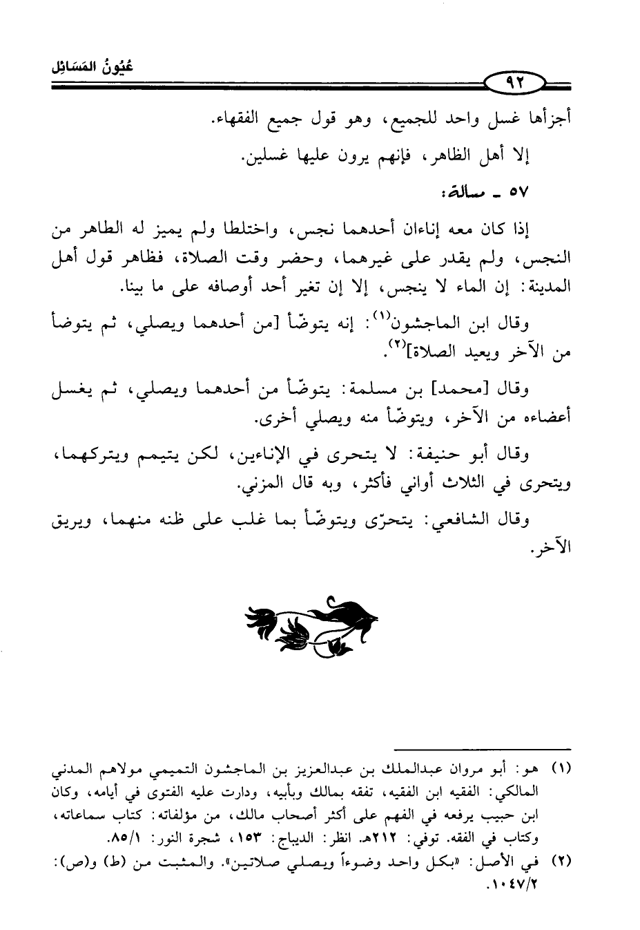(¬1) هو: أبو مروان عبد الملك بن عبد العزيز بن الماجشون التميمي مولاهم المدني المالكي: الفقيه ابن الفقيه، تفقه بمالك وبأبيه، ودارت عليه الفتوى في أيامه، وكان ابن حبيب يرفعه في الفهم على أكثر أصحاب مالك، من مؤلفاته: كتاب سماعاته، وكتاب في الفقه. توفي: 212 هـ. انظر: الديباج: 153، شجرة النور: 1/ 85.