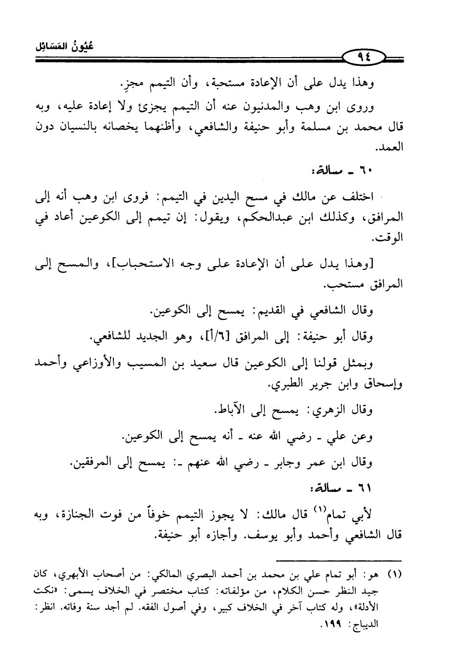 لأبي تمام (¬1) قال مالك: لا يجوز التَّيمُّم خوفًا من فوت الجنازة، وبه قال الشّافعيّ وأحمد وأبو يوسف. وأجازه أبو حنيفة.