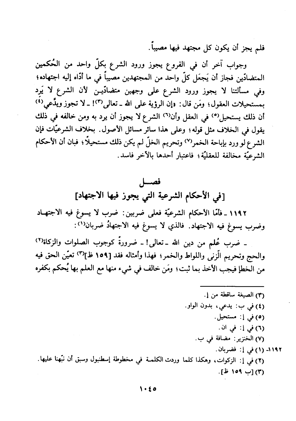 1192 - فأما الأحكام الشرعثة فعلى ضربين: ضرب لا يسوغ فيه الاجتهاد