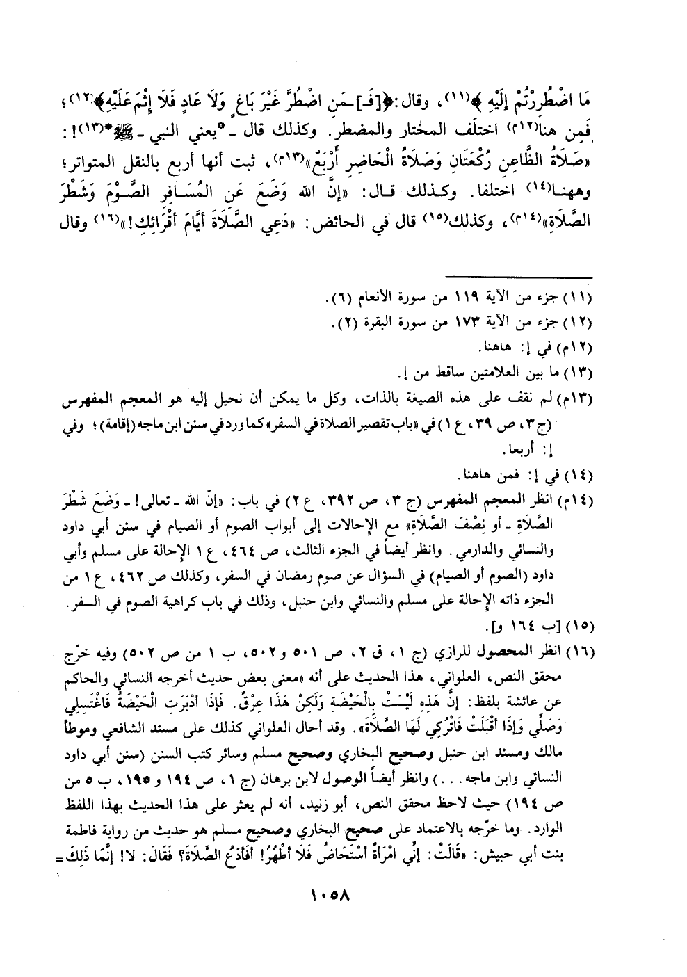 وصقي وإذا أقبلت فاتركي لها الضلاة". وقد أحال العلواني كذلك على مسند الشافعي وموطأ