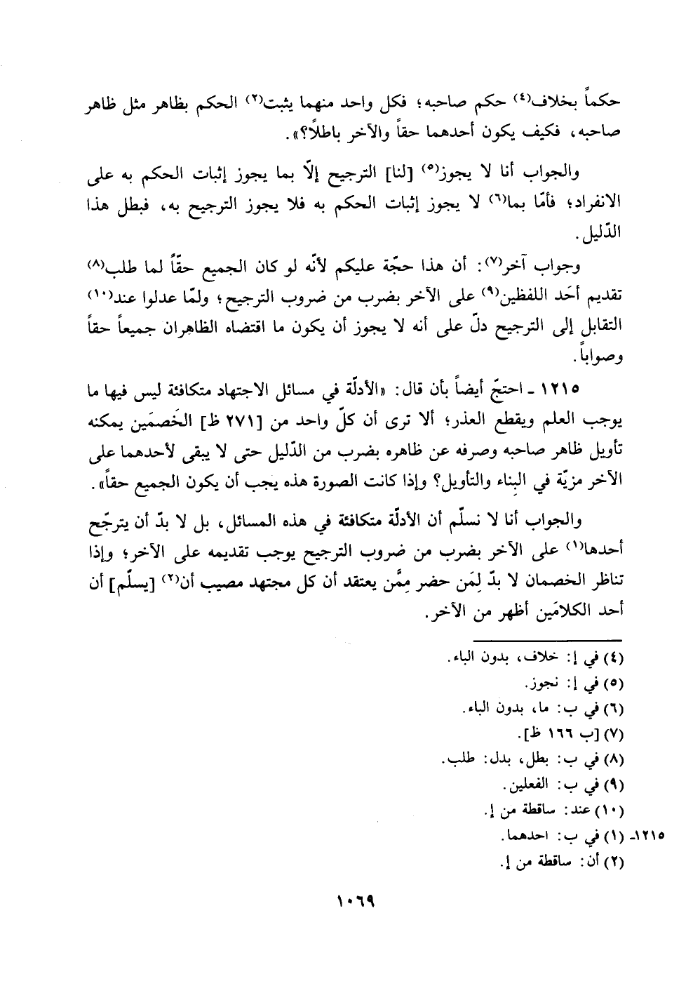 1215 - احتجّ أيضا بأن قال: "الأدئة في مسائل الاجتهاد متكافئة ليس فيها ما