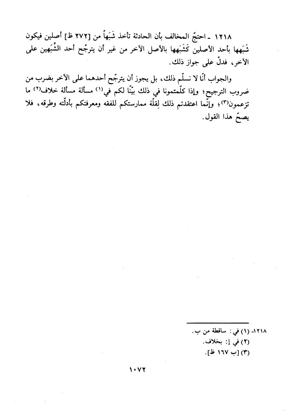 1218 - احتج المخالف باًن الحادتة تأخذ شبها من [272 ظ] أصلين فيكون