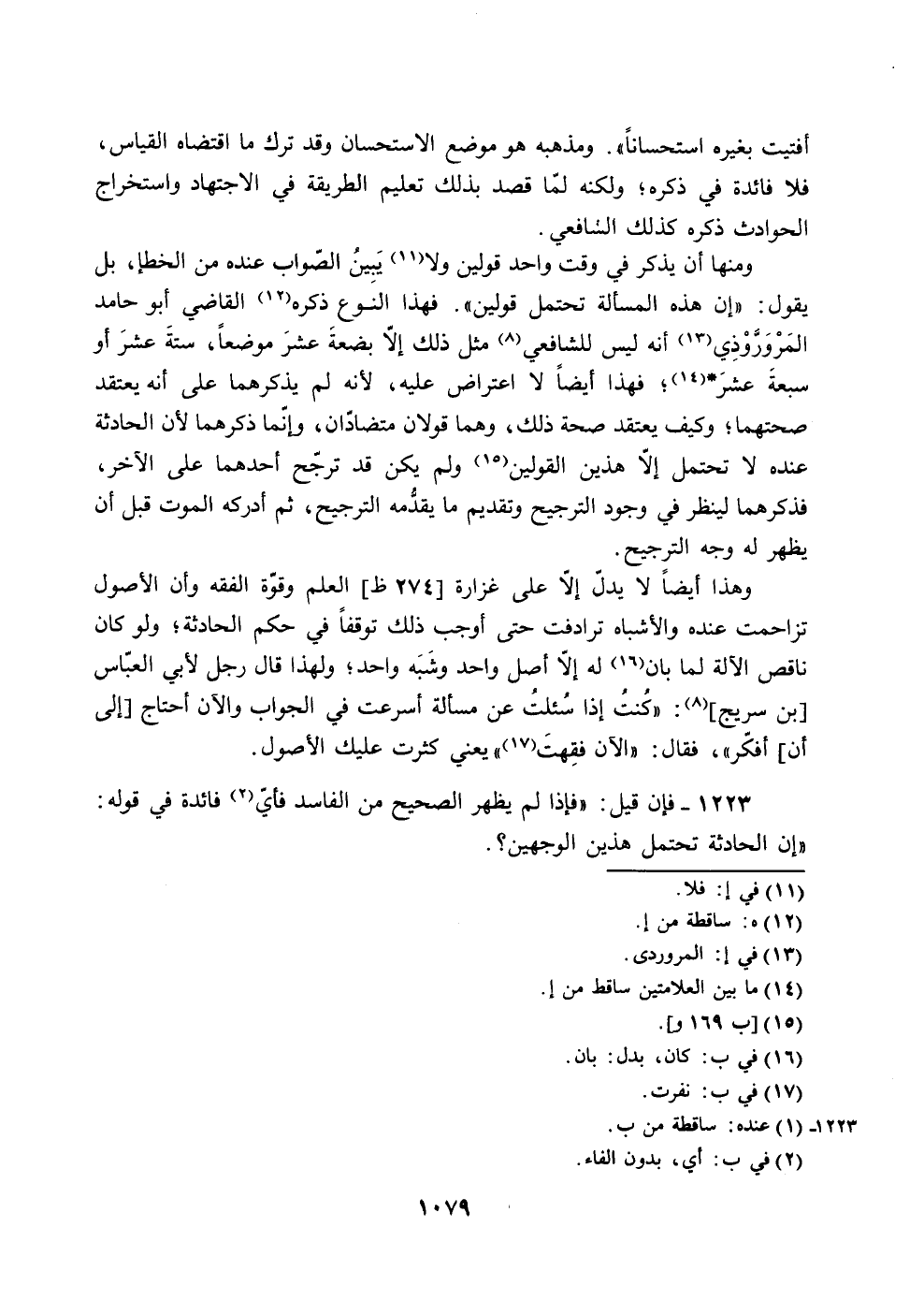 يقول: "إن هذه المسألة تحتمل قولين ". فهذا النوع ذكره (12) القاضي أبو حامد