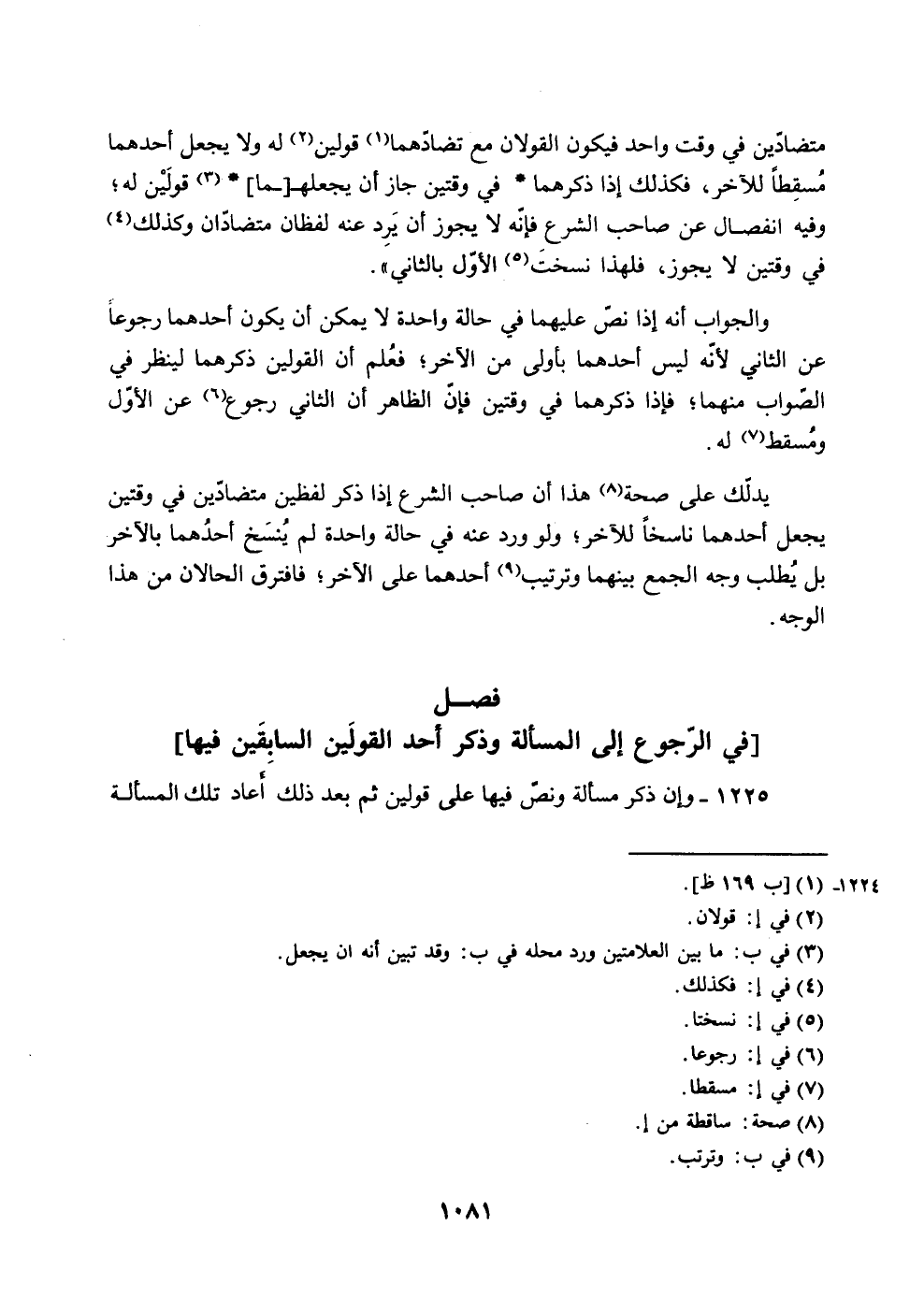 1225 - وإن ذكر مسألة ونصق فيها على قولين ثم بعد ذلك أعاد تلك المسألة
