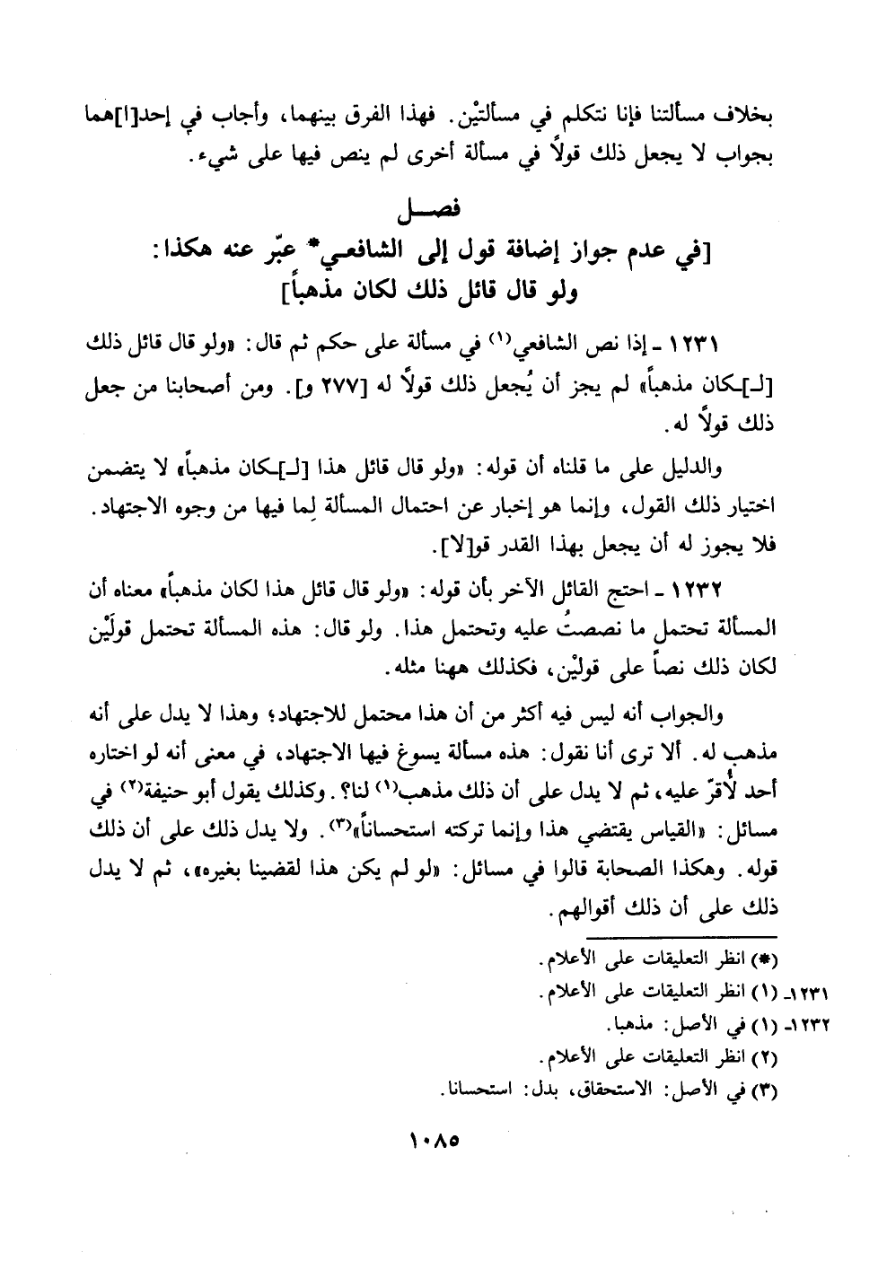 1231 - إذا نص الشافعي (1) في مسألة على حكم ثم قال: "ولو قال قاثل ذلك