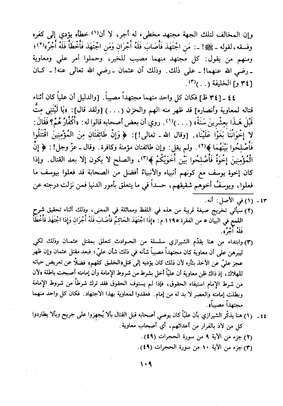 44 - [34 ظ] فكان كل واحد منهما مجتهدا مصيبا. [والدليل أن عليا كان أثناء