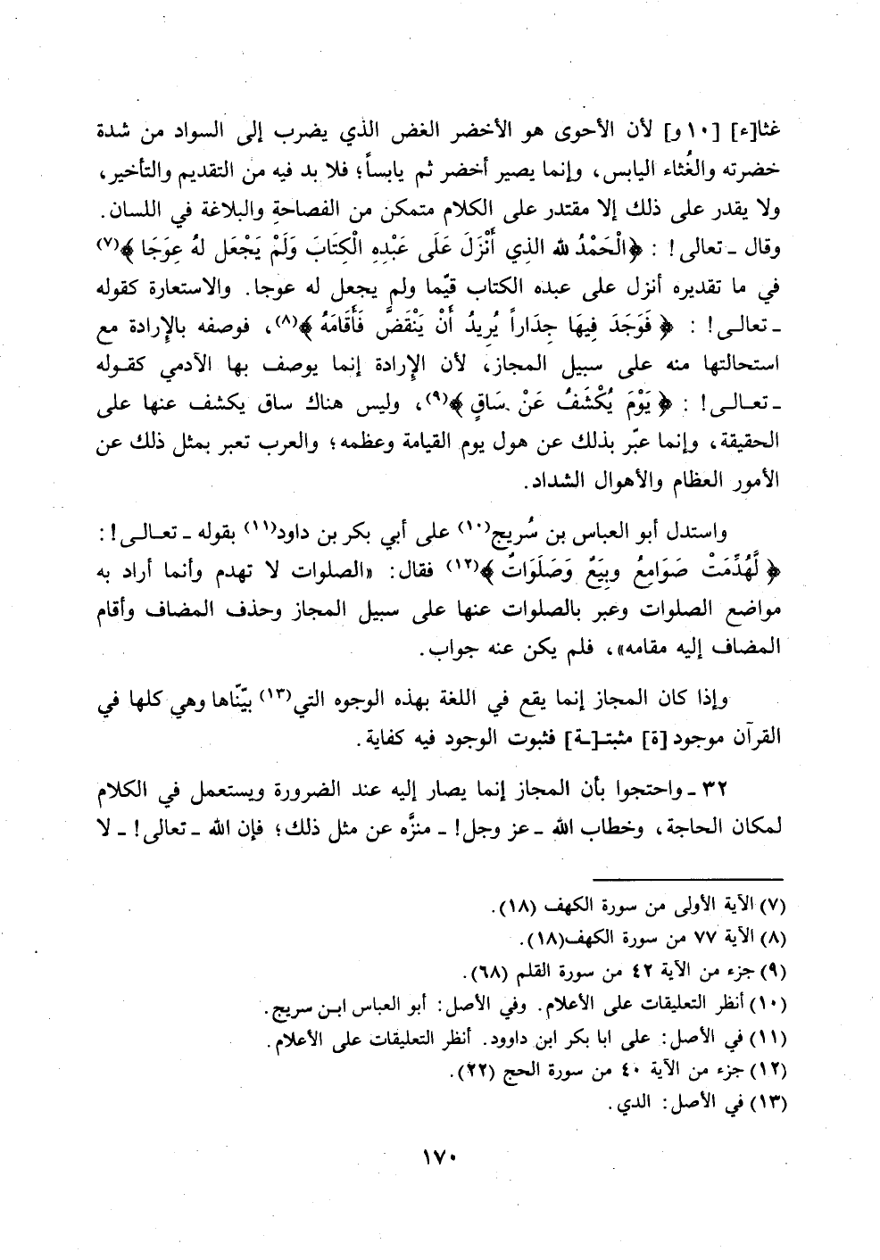 32 - واحتجوا بأن المجاز إنما يصار إليه عند الضرورة ويستعمل في الكلام