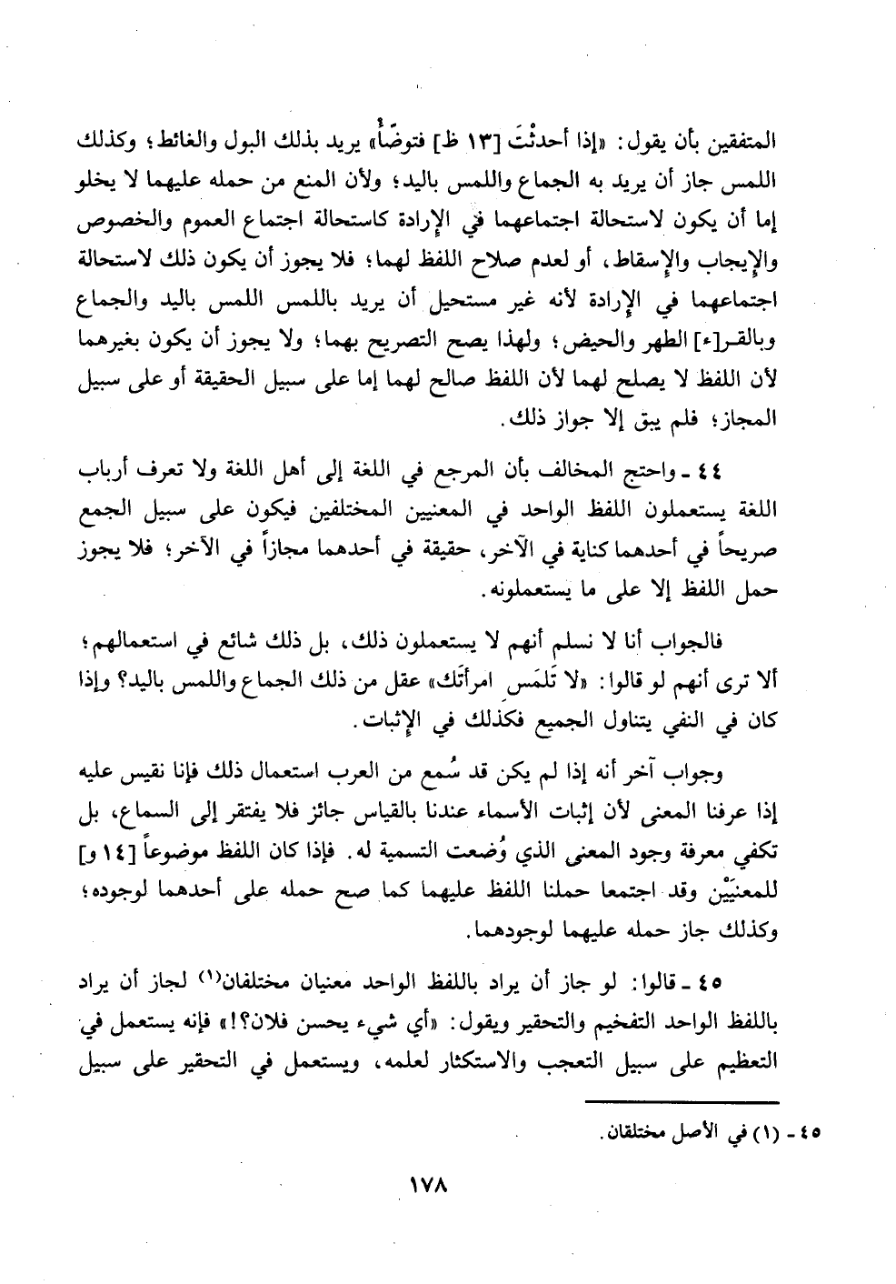 45 - قالوا: لو جاز أن يراد باللفظ الواحد معنيان مختلفان (1) لجاز أن يراد