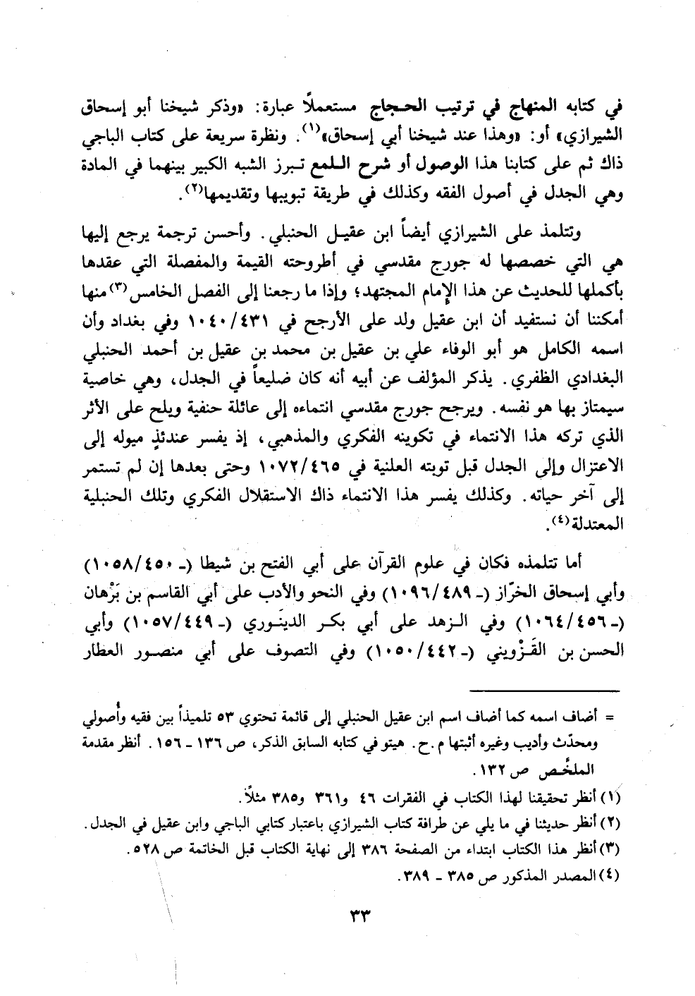 (2) أنظر حديثنا في ما يلي عن طرافة كتاب الشيرازي باعتبار كتابي الباجي وابن عقيل في الجدل.