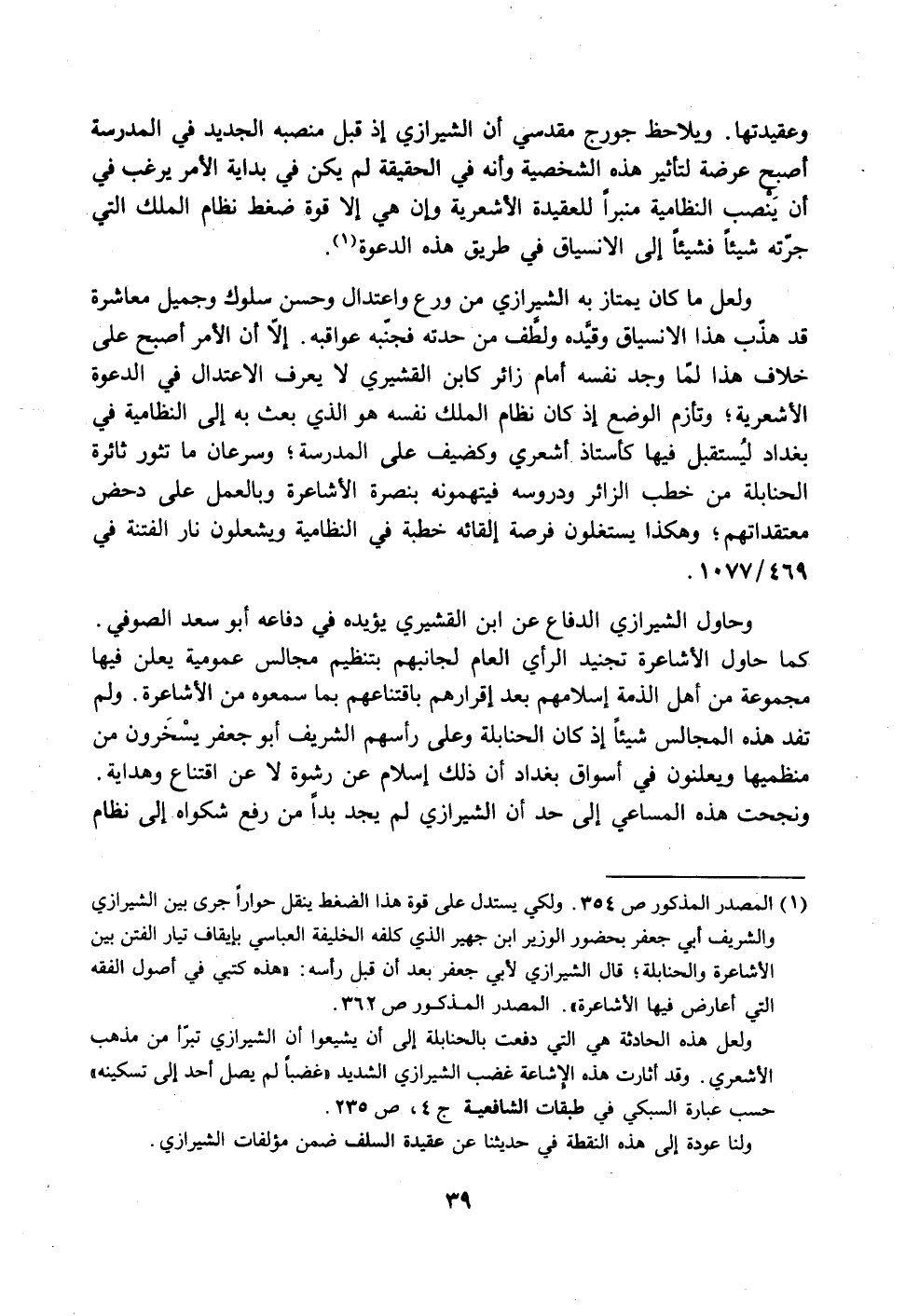 ولنا عودة الى هذه النقطة في حديثنا عن عقيدة السلف ضمن مؤلفات الشيرازي.