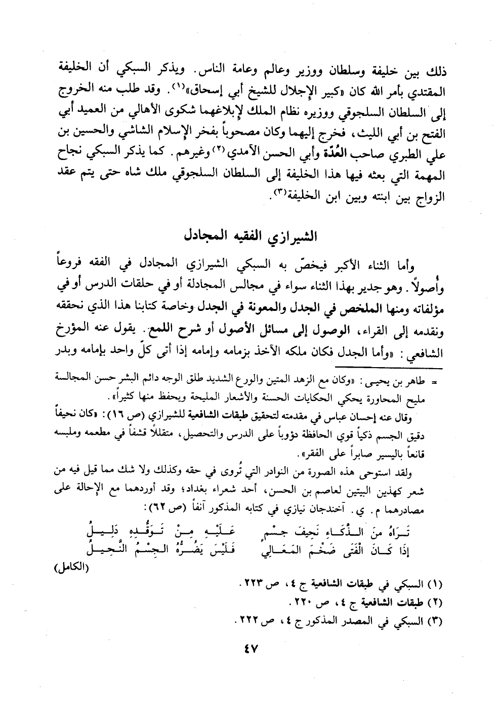 وأما الثناء الأكبر فيخص به السبكي الشيرازي المجادل في الفقه فروعا