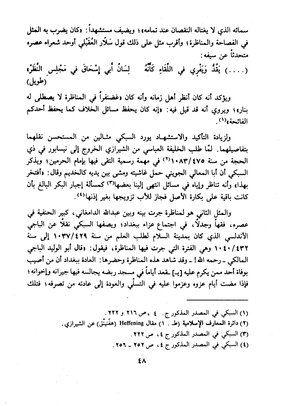 عصره، فقها وجدلا، في اجتماع عزاء ببغداد؛ ويصفها السبكي نقلا عن الباجي