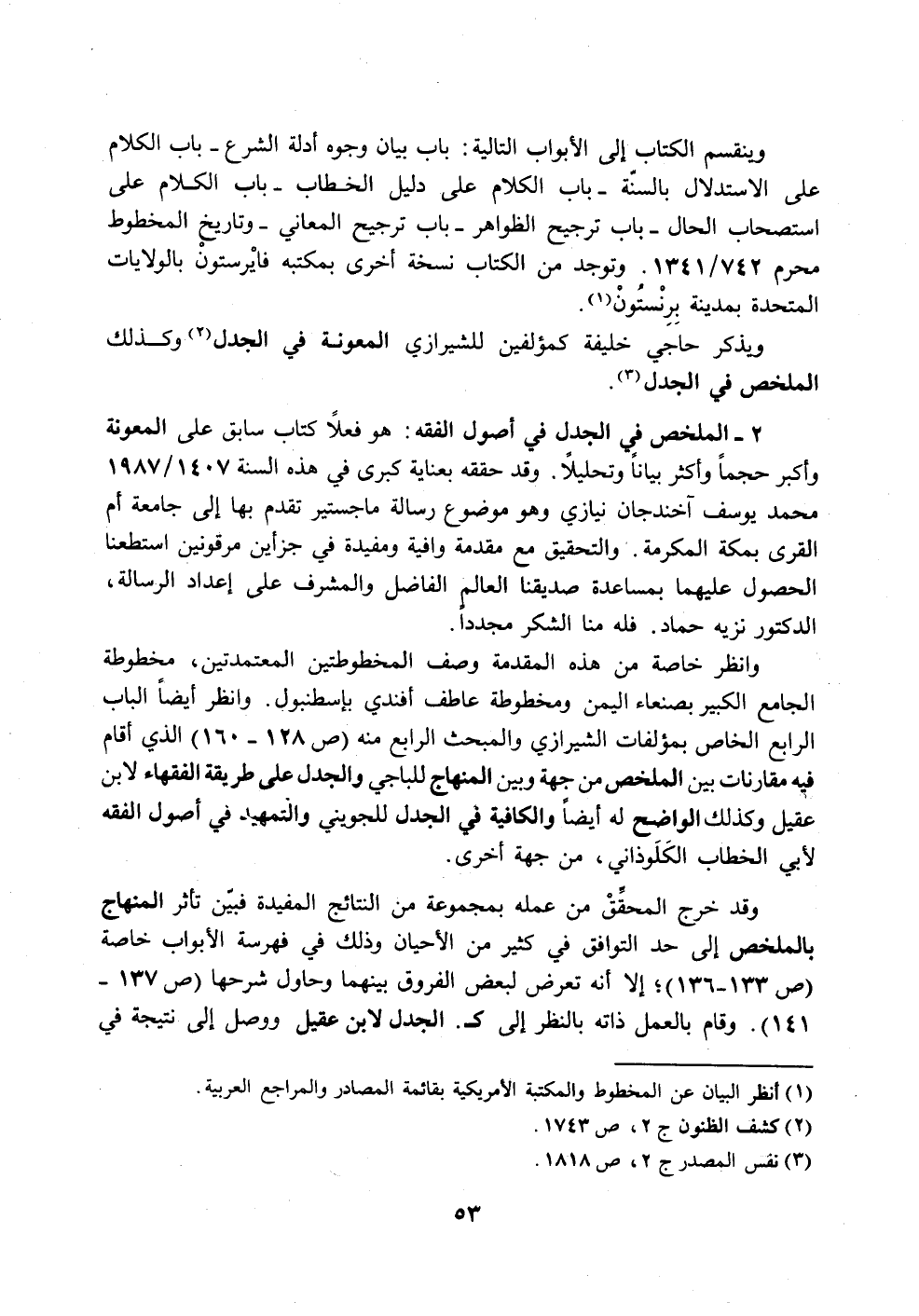 وتذكر حاجي خليفة كمؤلفين للشيرازي المعونة في الجدل (2) وكذلك