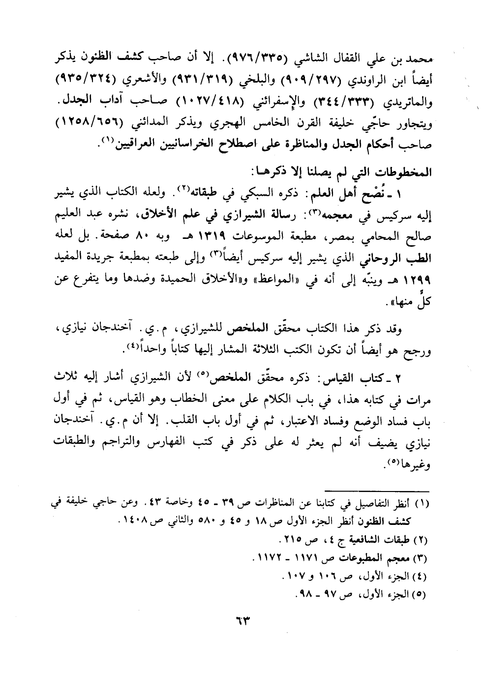 إليه سركيس في معجمه (3): رسالة الشيرازي في علم الأخلاق، نشره عبد العليم