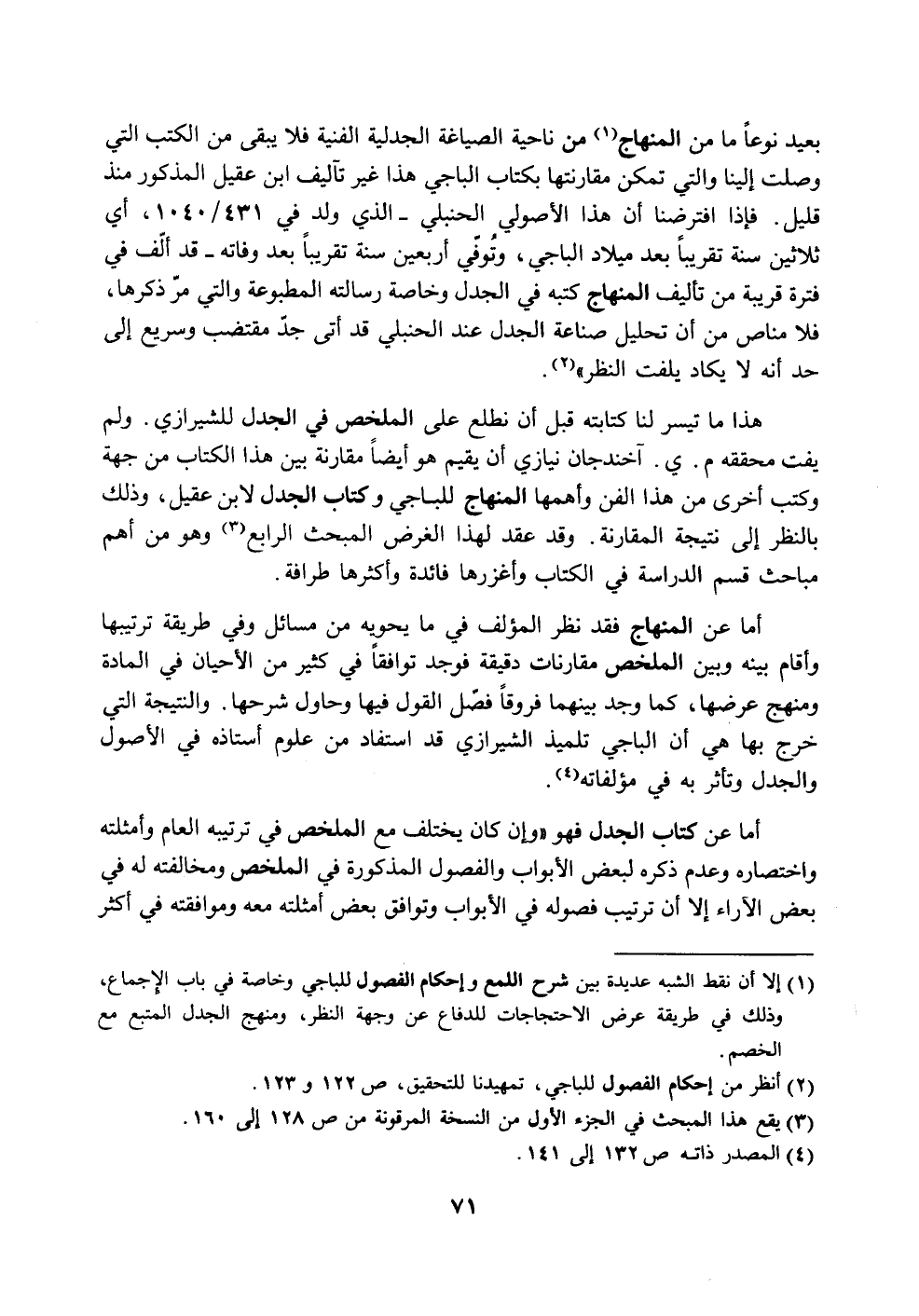 وصلت إلينا والتي تمكن مقارنتها بكتاب الباجي هذا غير تاليف ابن عقيل المذكور منذ