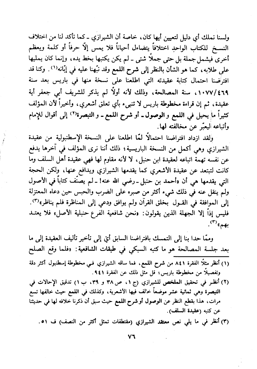 (1) انظر مثلا الفقرة 841 من شرح اللمع، فما ساقه الشيرازي في مخطوطة اسطنبول أكثر دقة
