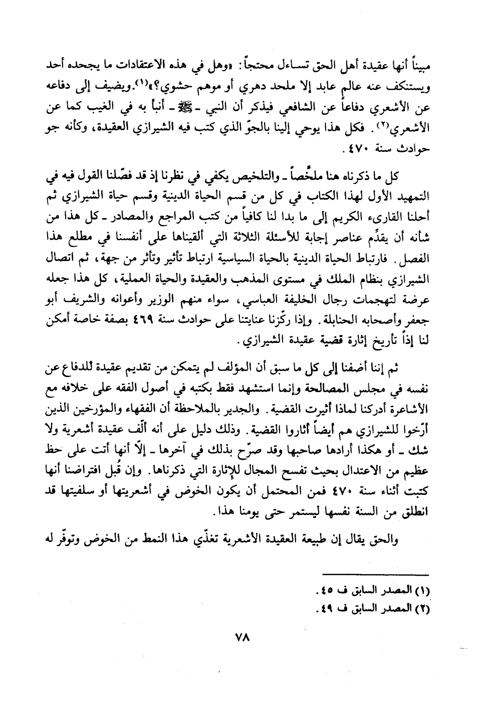 الأشعري (2). فكل هذا يوحي إلينا بالجؤ الذي كتب فيه الشيرازي العقيدة، وكانه جو