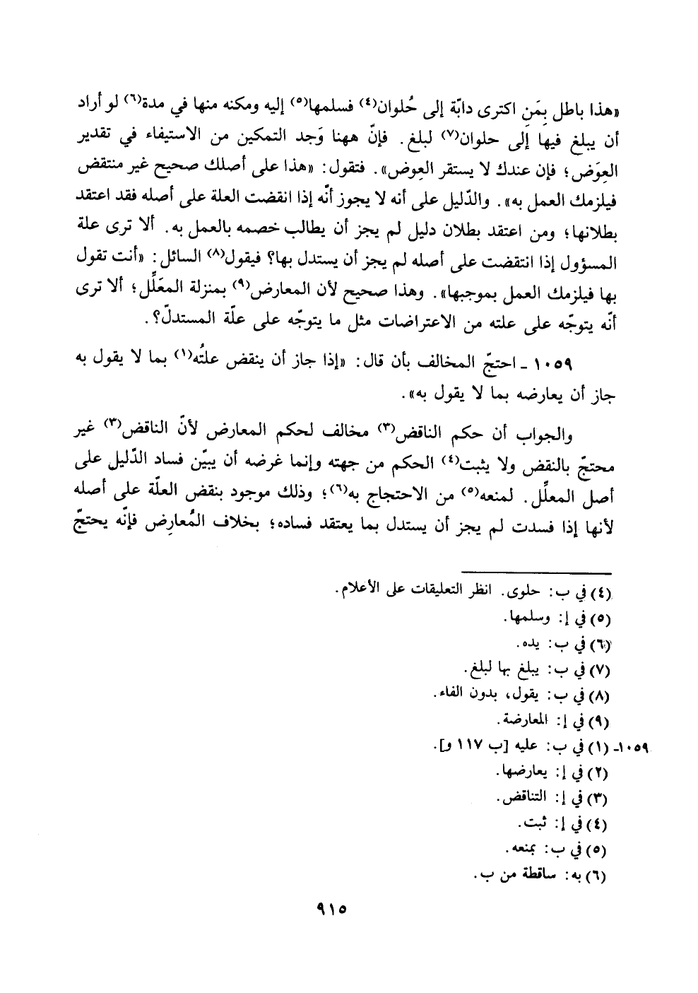 1059 - احتجّ المخالف بأن قال: "إذا جاز أن ينقض علته (1 (بما لا يقول به