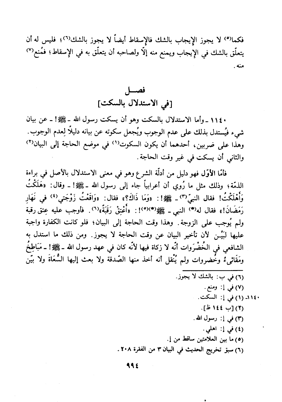1140 - وأما الاستدلال بالسكت وهو أن يسكت رسول الله -عن! - عن بيان