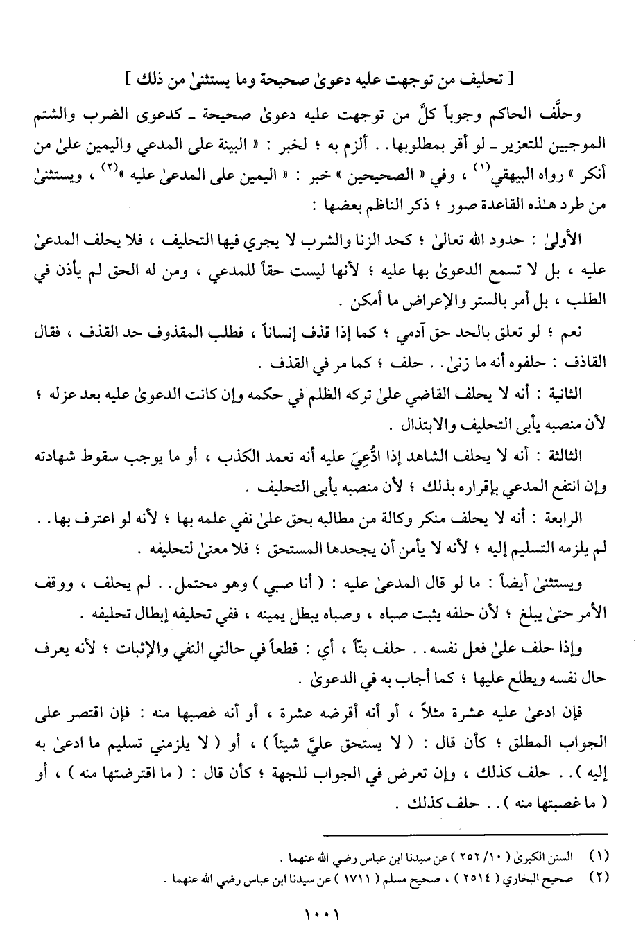 وحلَف الحاكم وجوباً كلَ من توجهت عليه دعوى صحيحة ـ كدعوى الضرب والشتم الموجبين للتعزيز ـ لو أقر بمطلوبها .. ألزم به؛ لخبر: «اليمين على المدعى عليه»، ويستثنى من طرد هذه القاعدة صور؛ ذكر الناظم بعضها: